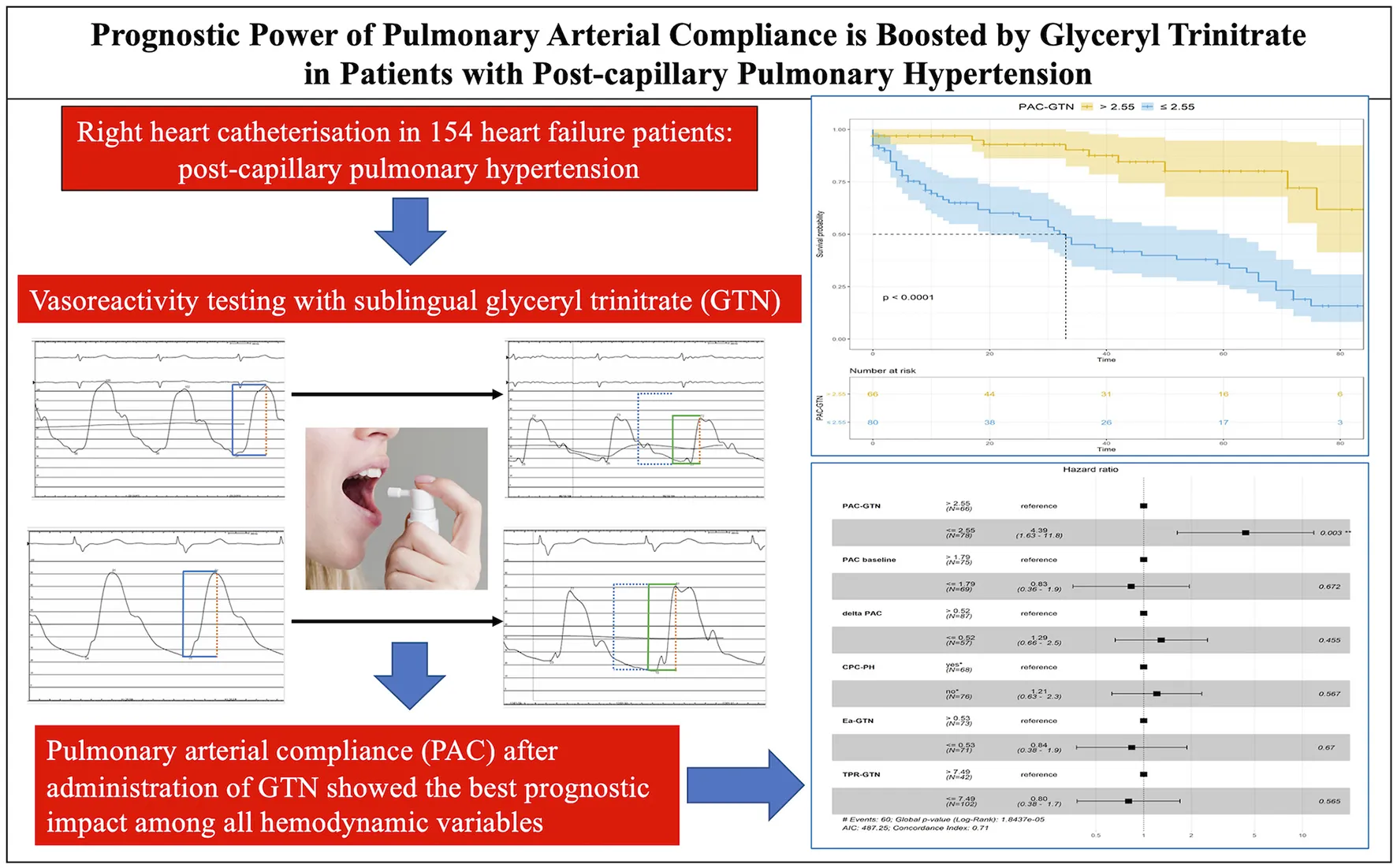 pulmonary arterial compliance, glyceryl trinitrate (GTN), vasoreactivity testing, post-capillary pulmonary hypertension, hemodynamics, prognosis