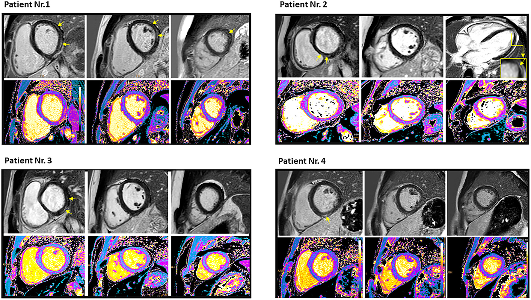 Cardiac magnetic resonance imaging of the four patients who had myocarditis following the third dose of mRNA COVID-19 vaccination demonstrated late gadolinium enhancement (yellow arrows) and T1 mapping (lower row). Patient no. 1: Mid wall late gadolinium enhancement involving 9% of the myocardium with corresponding myocardial injury in native T1 mapping imaging in antero- and infero-lateral segments of basal and mid ventricular short-axis view, as well as in the lateral segment of apical short-axis view. Native T1 value was 1,135 ms, and T2 value was 69.2 ms. Peak troponin was 240 ng/L, and scan delay (from COVID-19 vaccine) was 8 days. Patient no. 2: Mid wall late gadolinium enhancement involving 1% of the myocardium with corresponding myocardial injury in native T1 mapping imaging in the lateral segment of apical and in the septal segment of the basal short-axis view. Native T1 value was 1,077 ms, and T2 value was 57.5 ms. Peak troponin was 80 ng/L, and scan delay (from COVID-19 vaccine) was 40 days. Patient no. 3: Epicardial late gadolinium enhancement involving 3% of the myocardium with corresponding myocardial injury in native T1 mapping imaging in the inferior and inferolateral segments of the basal short-axis view. Native T1 value was 1,155 ms, and T2 value was 58.1 ms. Peak troponin T was 4,967 ng/L, and scan delay (from COVID-19 vaccine) was 47 days. Patient no. 4: Mid wall late gadolinium enhancement involving 1% of the myocardium with corresponding myocardial injury in native T1 mapping imaging in inferior segments of the basal and mid-ventricular short axis view, as well as in the lateral segment of the apical short axis view. Native T1 value was 1,041 ms, and T2 value was 57.4 ms. Peak troponin T was79 ng/L, and scan delay (from COVID-19 vaccine) was 42 days. Reference (normal) values: T1: 950–1,060 ms, T2: < 57 ms, and troponin T < 13 ng/L.