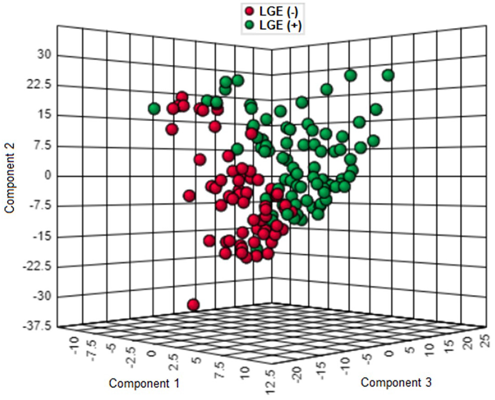 Three-dimensional score plot of proteomics profiling in patients with and without late gadolinium enhancement in the hypertrophic cardiomyopathy population. Each green circle represents the proteomic profile of a patient with LGE. Each red circle corresponds to that of a patient without LGE. HCM, hypertrophic cardiomyopathy; LGE, late gadolinium enhancement.