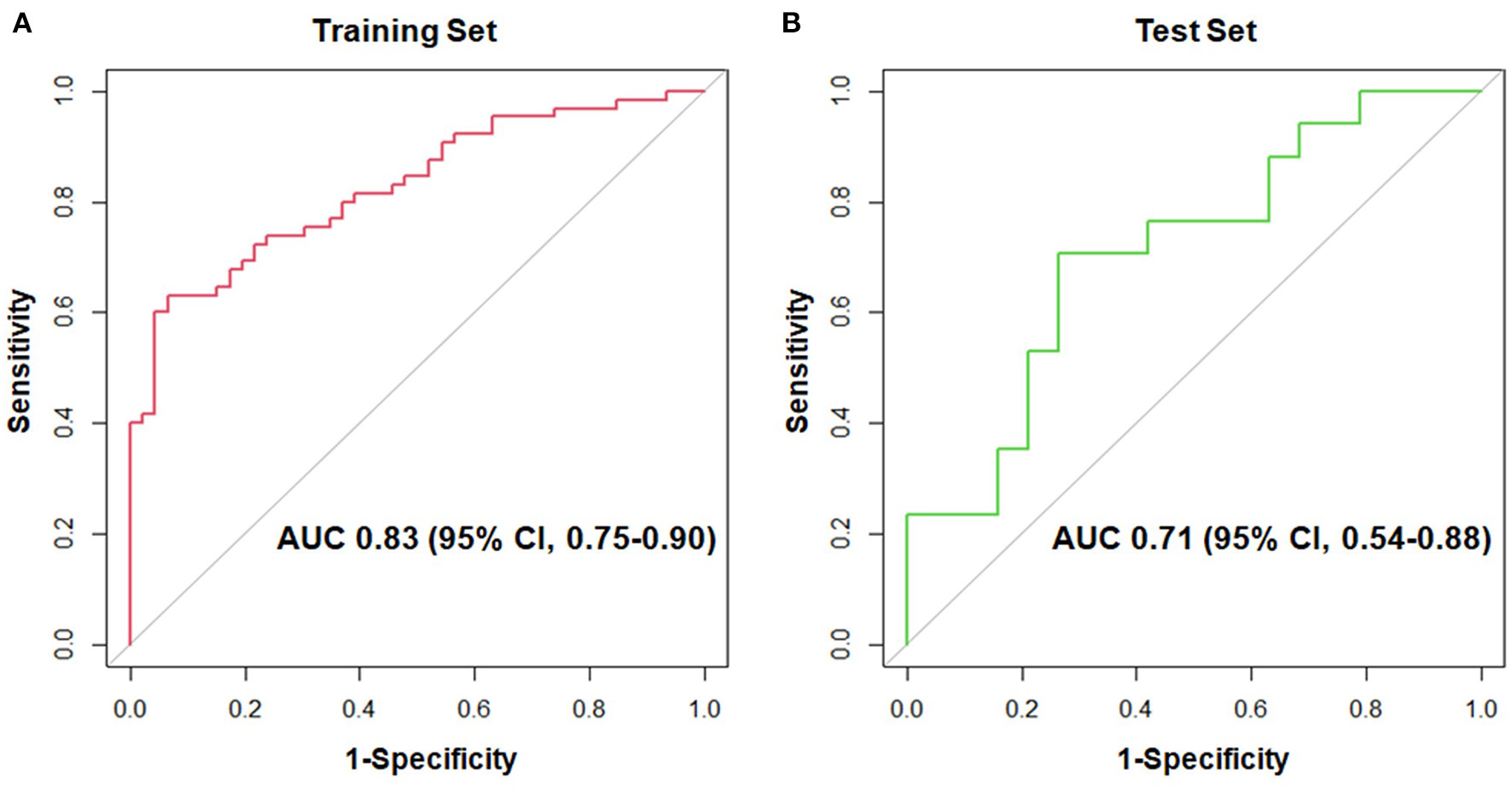 Receiver-operating-characteristic curves for the 17-protein model to distinguish patients with and without late gadolinium enhancement in the hypertrophic cardiomyopathy population. (A) shows the receiver-operating-characteristic curve in the training set, whereas (B) displays that in the test set. AUC, area under the receiver-operating-characteristic curve; CI, confidence interval.