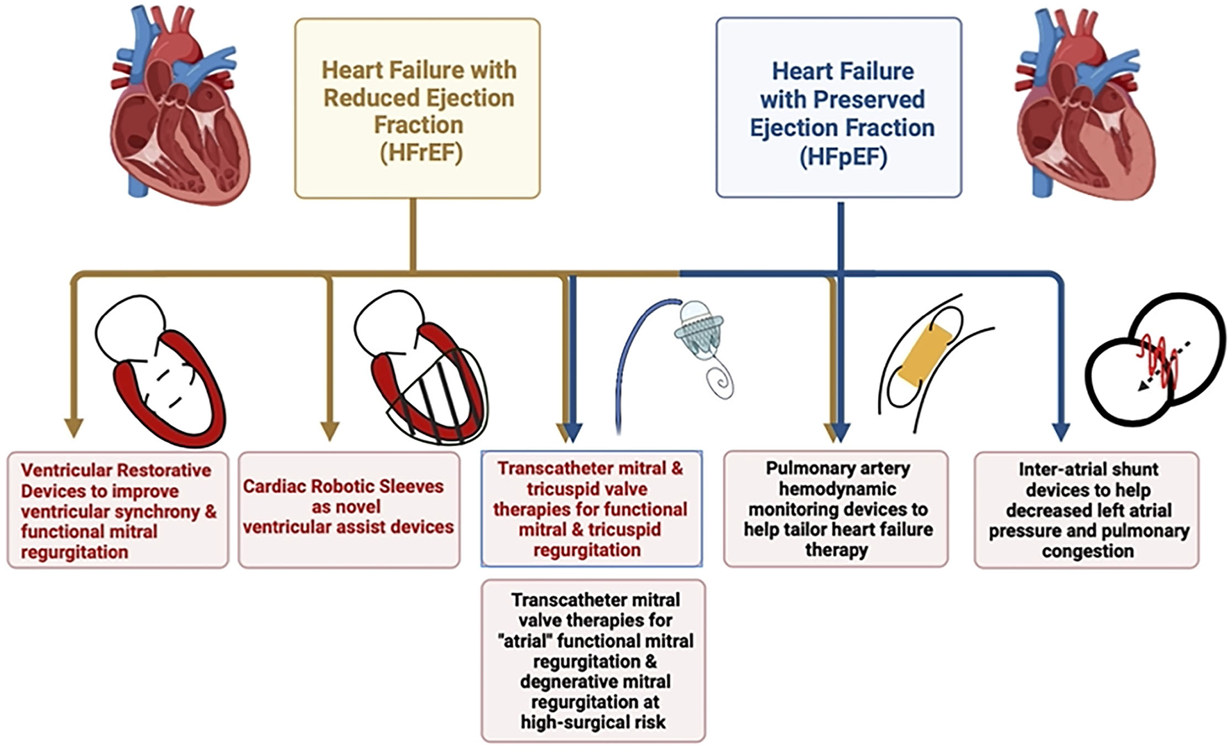 Schematic diagram highlighting the role of different structural interventions in heart failure with reduced and preserved ejection fraction.