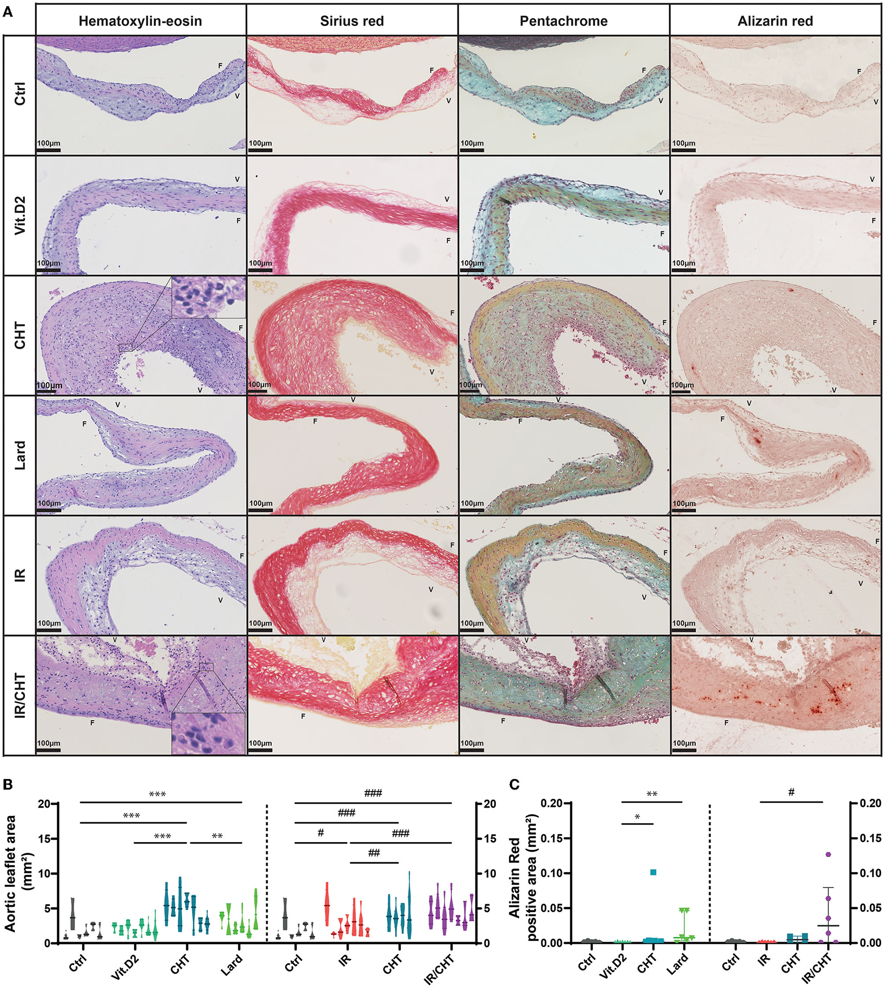 Effect of lard- and cholesterol-enriched diets on the aortic valve leaflet histology. (A) Representative pictures of aortic valve leaflet sections stained with hematoxylin-eosin, sirius red, Movat's pentachrome, and alizarin red per rabbit group as indicated. Magnified areas depict neutrophil infiltrates in valvular ventricularis. Scale bars = 100 μm. (B) Violin plots represent aortic valve leaflet area measured on hematoxylin-eosin-stained aortic valve sections (each violin box represents one rabbit, 4–8 slides per rabbit). Four-group comparisons were performed by using a nested-GLM model and post-hoc SIDAK test on log-transformed data. (C) The graph represents the positive area for Alizarin Red staining on the aortic valve sections. Data are presented as medians with P25-P75 interquartiles. Four-group comparisons were performed by ANOVA and post-hoc Dunnett's test on log-transformed data (Left: Ctrl, n = 5; Vit.D2, n = 7; CHT, n = 7; Lard, n = 6; Right: Ctrl, n = 5; IR, n = 6; CHT, n = 4; IR/CHT, n = 6). *P ≤ 0.05; **P ≤ 0.01; ***P ≤ 0.001; #P ≤ 0.05; ##P ≤ 0.01; ###P ≤ 0.001. F, indicates fibrosa side; V, indicates ventricular side.