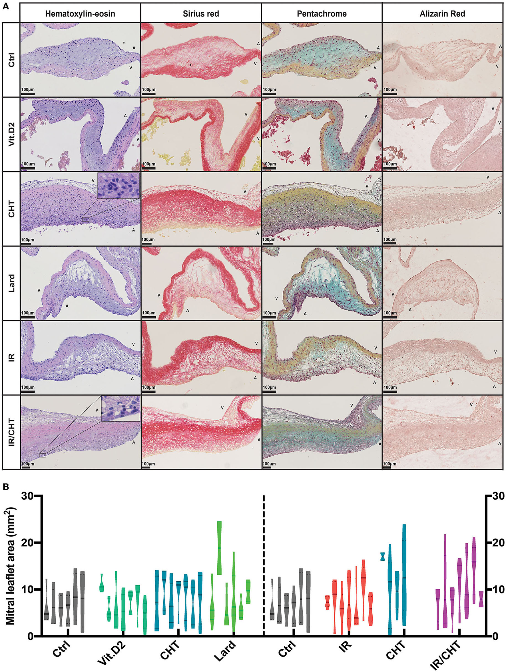 Effect of cholesterol-enriched diets on the mitral valve leaflet histology. (A) Representative pictures of mitral valve leaflet sections stained with hematoxylin-eosin, sirius red, and Movat's pentachrome per rabbit group as indicated. Magnified areas depict neutrophil infiltrates in valvular atrialis. Scale bars = 100 μm. (B) Violin plots represent mitral valve leaflet area measured on the histological mitral valve sections (each violin box represents one rabbit, 4–8 slides per rabbit) stained with hematoxylin-eosin. Four-group comparisons were performed by using a nested-GLM model and post-hoc SIDAK test on log-transformed data. P = non-significant. A, indicates atrial side; V, indicates ventricular side.