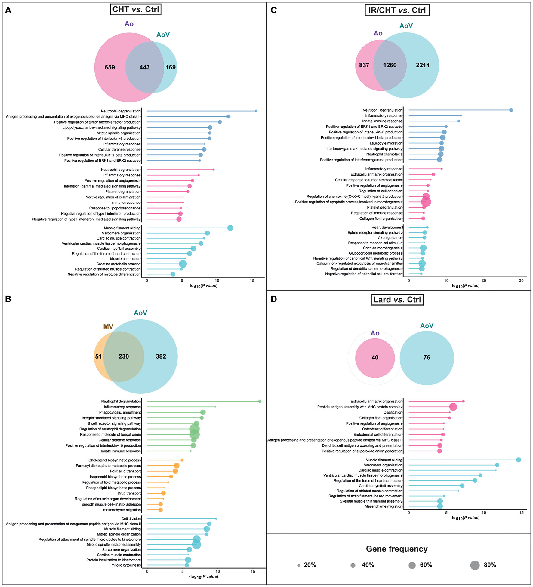 RNA sequencing (RNAseq) analysis of differentially expressed genes (DEGs) in the aorta, the aortic valve, and the mitral valve induced by cholesterol-enriched diet (CHT), alone or combined with irradiation (IR/CHT), and lard-enriched diet as compared to chow diet (Ctrl) (Ctrl, n = 7; CHT, n = 6; Lard, n = 7; IR/CHT, n = 7). Venn diagrams represent numbers of specific and common DEGs between tissue pairs for each comparison. Lollipop plots of gene ontology (GO) terms depict the top 10 biological processes affected by specific and common DEGs, with corresponding gene frequency and -log10 (P-value) (Wald test in DESeq2 package). Detailed statistical methods are provided in the Methods section. (A) Comparison of DEGs and affected biological processes in the aorta and aortic valve following 16-week treatment with a cholesterol-rich diet. (B) Comparison of DEGs and affected biological processes in the aortic and mitral valves following 16-week treatment with a cholesterol-rich diet. (C) Comparison of DEGs and affected biological processes in the aorta and aortic valve following 16-week treatment with a cholesterol-rich diet combined with irradiation. (D) Comparison of DEGs and affected biological processes in the aorta and the aortic valve following 16-week treatment with a lard-rich diet. Ao, aorta; AoV, aortic valve; MV, mitral valve.