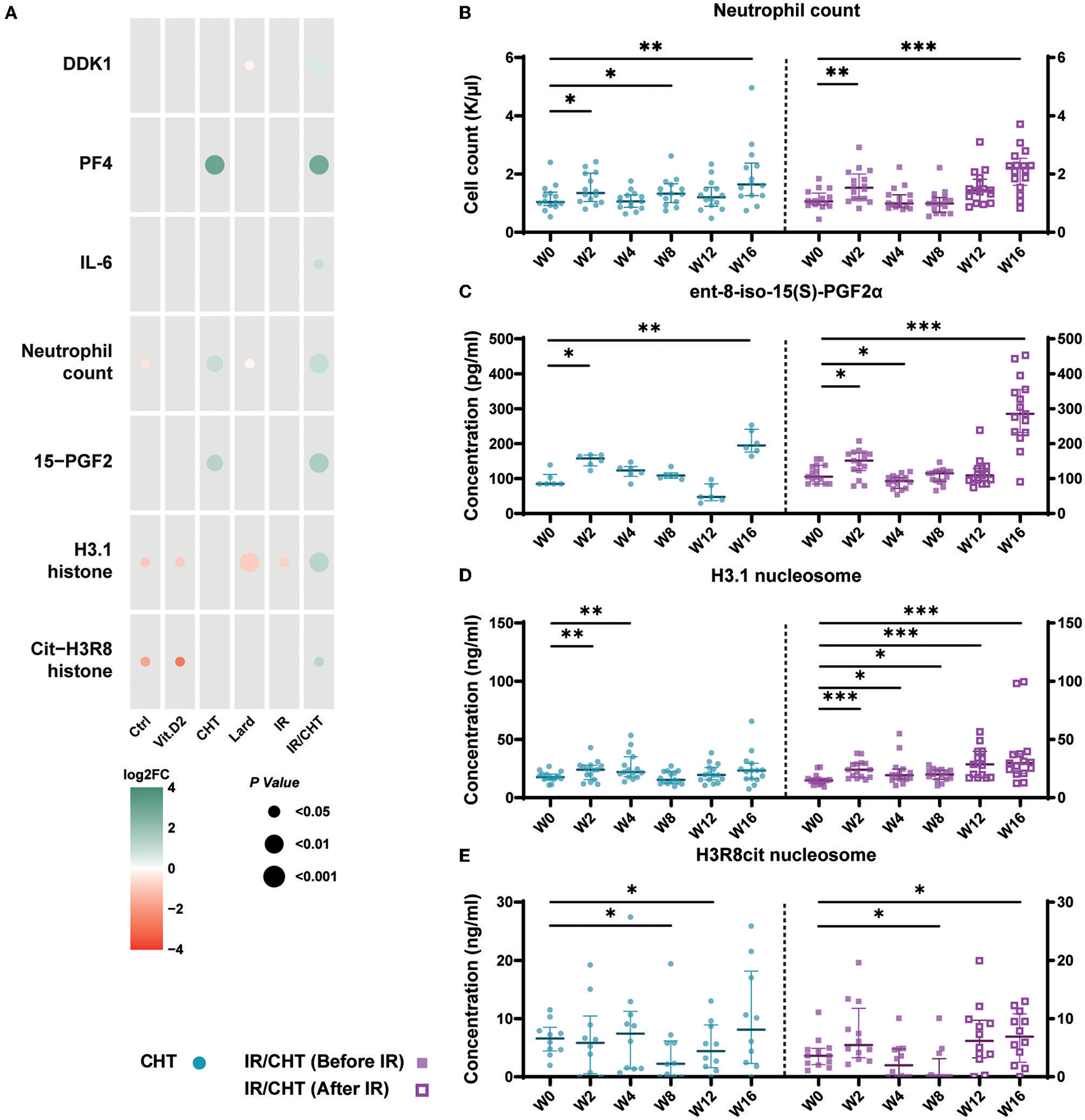 Effect of cholesterol- and lard-enriched diets, and irradiation on the circulating biomarkers of calcification, platelet activation, inflammation, oxidative stress, and on circulating nucleosomes. (A) Bubble plot represents concentration fold-change of biomarkers of interest between week 16 (W16) and baseline. Over time evolution of neutrophil count. (B) 15-PGF2 (C) and circulating nucleosomes (D,E). Graphs represent median with P25-P75 interquartiles. *P ≤ 0.05; **P ≤ 0.01; ***P ≤ 0.001 (Wilcoxon signed-rank test; Ctrl, n = 7–13; Vit.D2, n = 7; CHT, n = 10–15; Lard, n = 7–12; IR, n = 7; IR/CHT, n = 15).