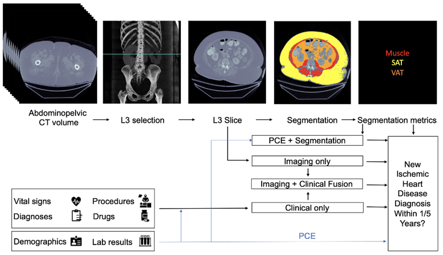 In the Segmentation Only model, the authors used a Convolutional Neural Network (CNN) (16), known as a 2D U-Net model, to segment body composition biomarkers, which consisted of identification of muscles, visceral adipose tissue (VAT), and subcutaneous adipose tissue (SAT). A logistic regression model was then constructed based on the extracted measurements to predict IHD outcomes at 1 and 5 years. The Imaging Only Model was constructed using the EfficientNet-B6 network (17), a CNN-based model, to predict IHD using a single slice from a CT image. Their third model (the Clinical Only model) was developed to model clinical and demographic features from the EMR within 1 year of image acquisition and included features such as demographic data, vital signs (blood pressure, heart rate, respiratory rate, oxygen saturation, temperature), body mass index, and relevant laboratory results (total, low-density lipoprotein, high-density lipoprotein cholesterol, triglycerides, fasting glucose and hemoglobin A1c). The Clinical Only model predictions were performed using an XGBoost algorithm (18). Finally, to evaluate the performance of adding imaging to different data types, three fusion models were constructed. The first fusion model was constructed based on Pooled Cohort Equations (PCE), average muscle radiodensity, and the VAT/SAT ratio from the Segmentation Only model. In the second model, features from the Imaging Only model and Clinical ones were fused. Finally, the third fusion model combined the three modalities of Imaging, Clinical, and Segmentation data.