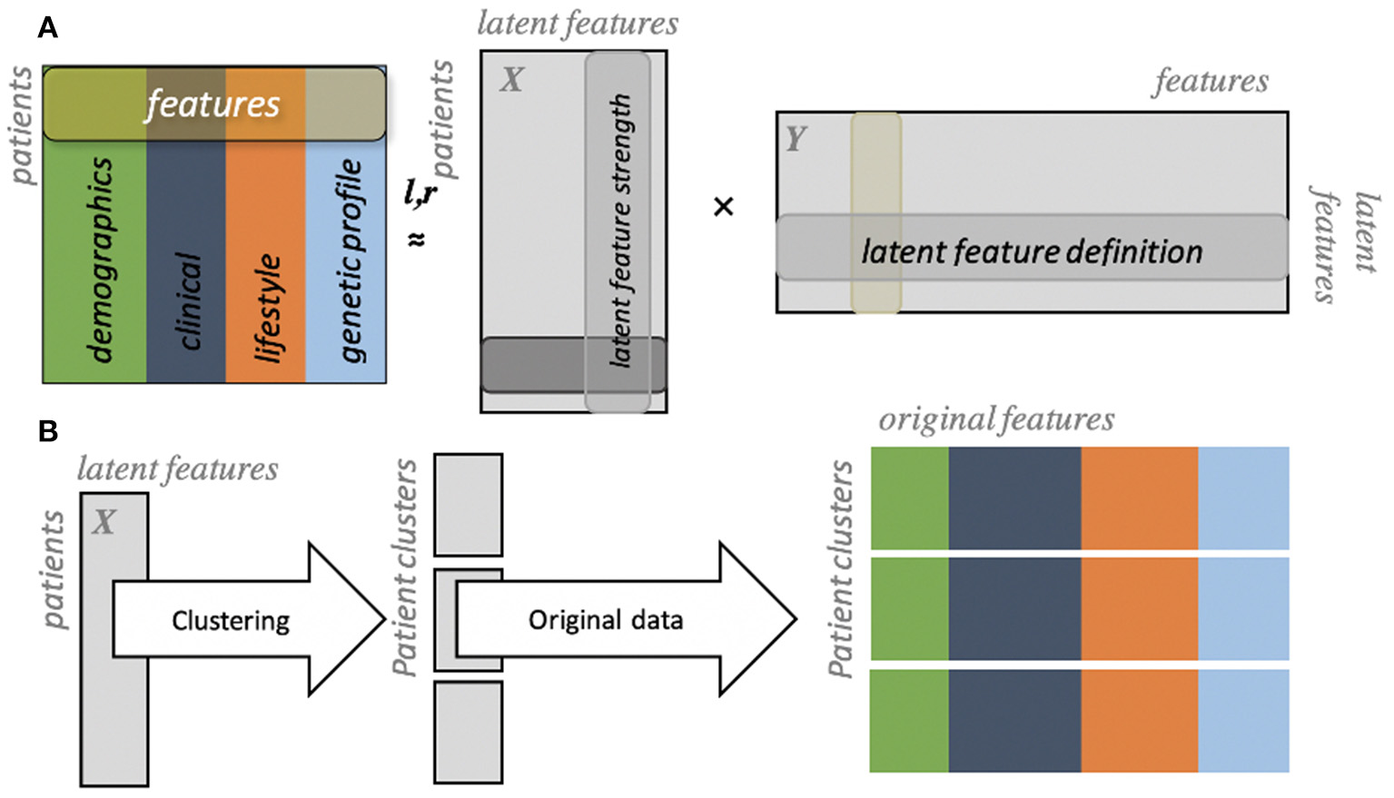 Figure 3. Generalized low rank modeling. (A) Multiple features are summarized into two low rank matrices (X and Y). (B) Individuals can then be clustered using latent features, after which original features can be re-identified to summarize clinical features of each group [from Flores et al. (27)].