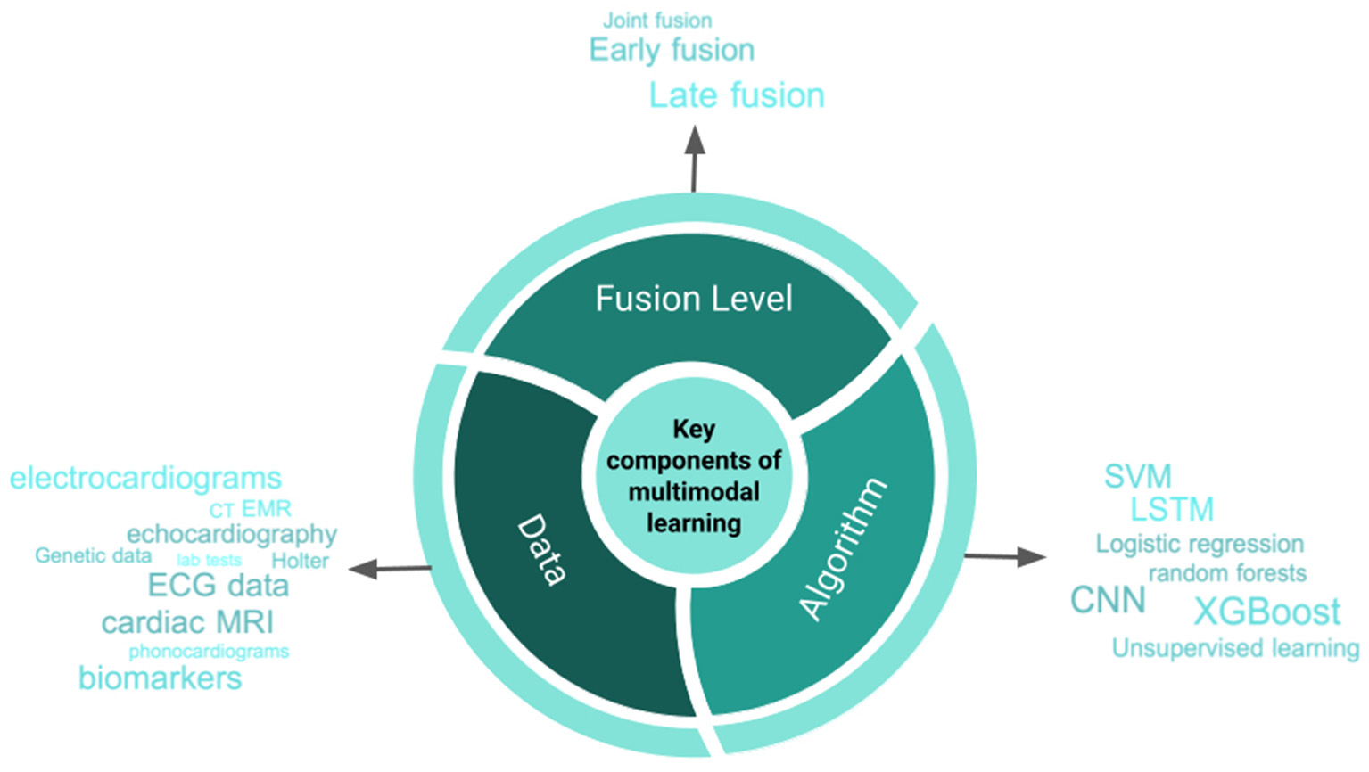 In other words, data fusion aims to overcome problems that arise by using only one type of data. For instance, while medical imaging provides exquisite anatomical detail, it does not contain other important information such as demographics or clinical diagnoses that can enrich clinical prediction or phenotyping tasks. Other data, such as unstructured medical records, contain rich phenotypic data but also suffer from issues of missing data and encoding medical practice rather than true biology. Such data can be combined with genetics and/or physical activity data to supplement missing data from imaging and/or unstructured medical records. However, with the exciting promise of data fusion comes interesting and important technical challenges; chief among them is transforming different data types into a format that enables efficient processing by machine learning algorithms. Though examples of multi-modal data and machine learning models in the cardiovascular space are limited, nevertheless, in this review, we highlight specific use cases focused on diagnostics, prediction, and clinical decision making (Table 1). We discuss technical considerations for data fusion modeling and conclude with recommendations for future directions.
