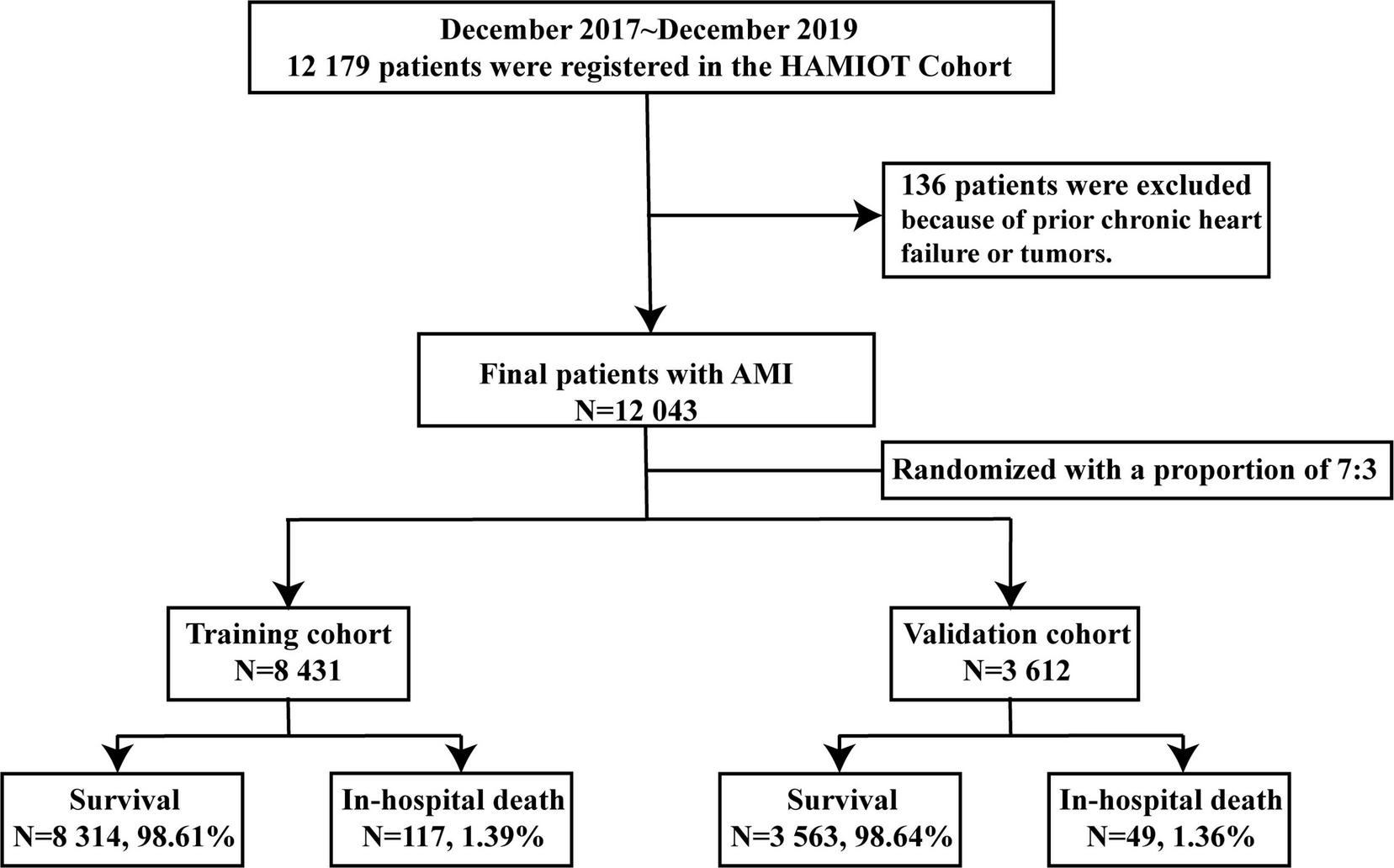 Study flow chart of the HAMIOT Cohort Study. From December 2017 to December 2019, 12,043 patients with AMI were randomly assigned into the training (n = 8,431) and validation (n = 3,612) cohorts. HAMIOT, the Heart failure after Acute Myocardial Infarction with Optimal Treatment; AMI, acute myocardial infarction.