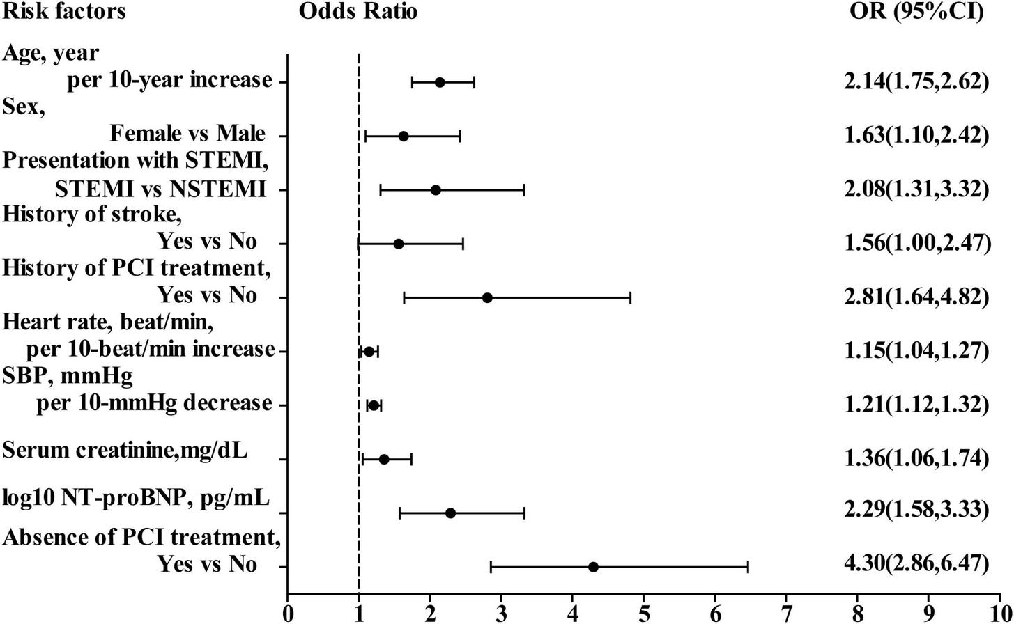 In the training cohort, the association between each baseline characteristic and in-hospital mortality was analyzed using the univariate logistic regression model and was presented in Table 2 (for continuous variables) and Table 3 (for categorical variables). Patients who died in the hospital were more likely to be old, female, and had an elevated heart rate, low SBP and diastolic blood pressure, high incidence of previous diseases (diabetes, hypertension, coronary artery bypass graft, PCI treatment, and stroke), low rate of treatment with medication (aspirin, clopidogrel or ticagrelor, and statins) and PCI treatment (each P < 0.05). For laboratory findings, alanine transaminase, aspartate aminotransferase, and fasting plasma glucose were higher, and triglyceride, total cholesterol, and high-density lipoprotein cholesterol were lower in dead patients compared to survival patients (each P < 0.05). The initial levels of serum creatinine, NT-proBNP and cardiac enzymes (creatine kinase, creatine kinase-MB and cardiac troponin I) were high in the non-survival patients (each P < 0.05).