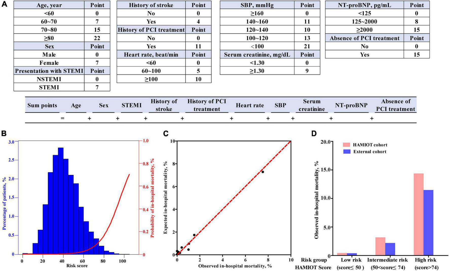 A total of 12,179 patients with AMI participated in the HAMIOT cohort, and 136 patients were excluded. In-hospital mortality was 166 (1.38%). Ten predictors were found to be independently associated with in-hospital mortality: age, sex, history of percutaneous coronary intervention (PCI), history of stroke, presentation with ST-segment elevation, heart rate, systolic blood pressure, initial serum creatinine level, initial N-terminal pro-B-type natriuretic peptide level, and PCI treatment. The c-statistic of the novel simplified HAMIOT risk score was 0.88, with good calibration (Hosmer–Lemeshow test: P = 0.35). Compared with the Global Registry of Acute Coronary Events risk score, the HAMIOT score had better discrimination ability in the training (0.88 vs. 0.81) and validation (0.82 vs. 0.72) cohorts. The total simplified HAMIOT risk score ranged from 0 to 121. The observed mortality in the HAMIOT cohort increased across different risk groups, with 0.35% in the low risk group (score ≤ 50), 3.09% in the intermediate risk group (50 < score ≤ 74), and 14.29% in the high risk group (score > 74).