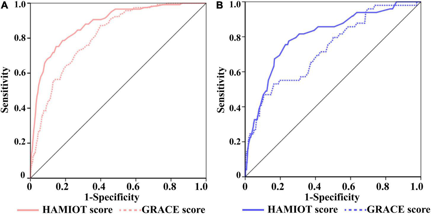 Discrimination and calibration were evaluated using the c-statistic or receiver operating characteristic (ROC) curve and the Hosmer–Lemeshow goodness-of-fit test, respectively. Internal validation was evaluated using the bootstrap techniques (1,000 replications) to obtain optimism corrected c-statistics (21). External validation of the HAMIOT risk score was assessed using a prospectively subsequent AMI cohort from the Second Affiliated Hospital of Harbin Medical university. In addition, the performance of the HAMIOT risk score was assessed in selected subgroups, including age (<60 vs. ≥60 years), sex (female vs. male), body mass index (BMI) (<25 vs. ≥25 kg/m2), presentation with ST-segment elevation (STEMI vs. NSTEMI), current smoking (yes vs. no), history of stroke (yes vs. no), Killip class (I vs. II–IV), cardiac arrest (yes vs. no), and PCI treatment during hospitalization (yes vs. no). Moreover, the novel HAMIOT risk score was compared to the GRACE risk score in the training, validation and subgroup cohorts. Finally, we calculated the net reclassification improvement (NRI), which focused on the improvement that patients were appropriately assigned to different risk groups (low risk, score ≤ 50; intermediate risk, 50 < score ≤ 74; high risk, score > 74), and the integrated discrimination index (IDI), which evaluated how well the HAMIOT risk score increased prognostic accuracy (22).