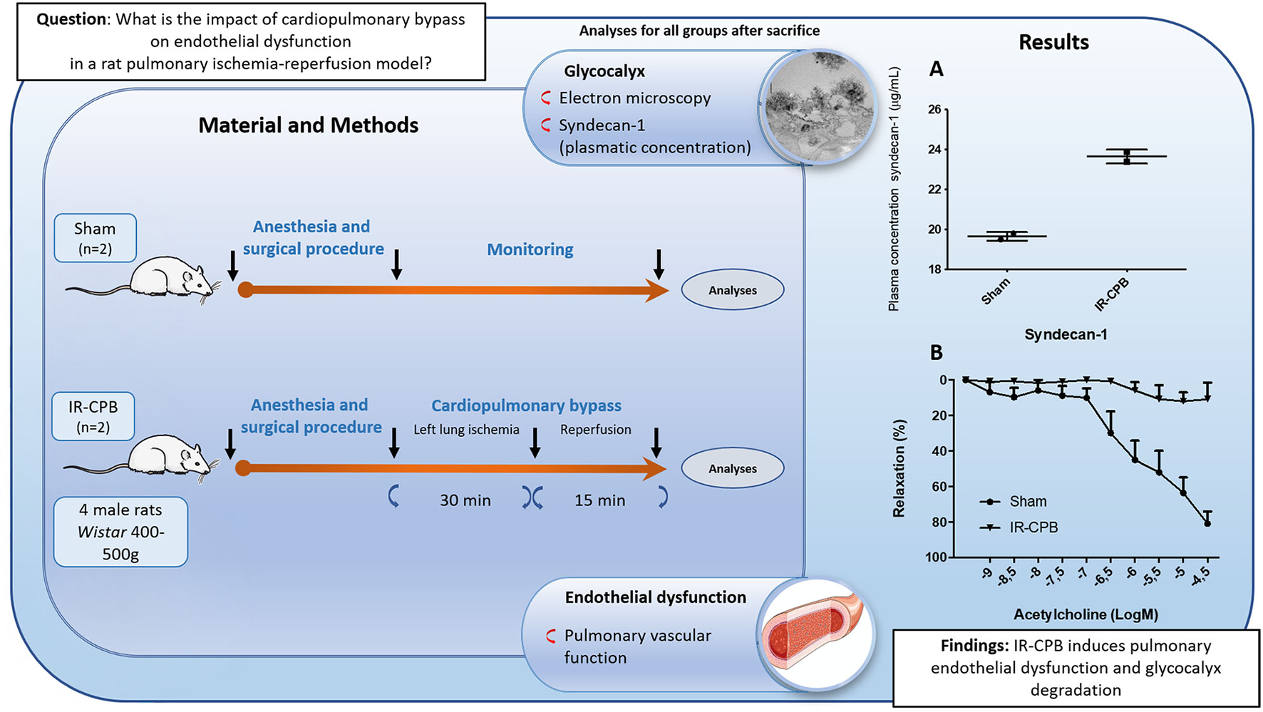 Schematic diagram of the experimental procedure. CPB, cardiopulmonary bypass; IR, ischemia-reperfusion; (A) Glycocalyx degradation. Plasma concentration of syndecan-1. (B) Relaxation to acetylcholine after precontraction with phenylephrine (endothelium-dependent relaxation). Responses are expressed as percentage relaxation of phenylephrine-induced precontraction (mean ± SEM).
