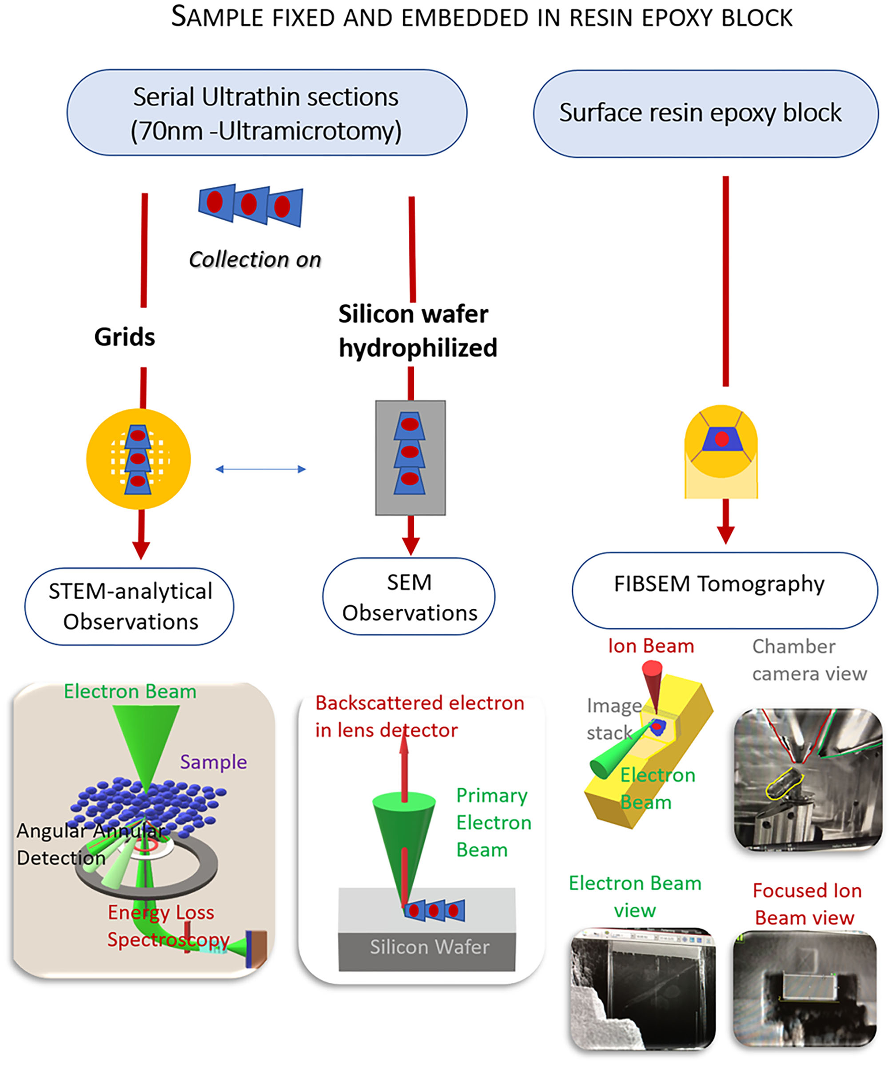 The innovative character of this study is to combine different EM techniques on a single sample prepared under conventional procedures known as ex-situ correlative technics. SEM and TEM observations were done on ultrafine sections, while FIB-SEM tomography was prepared from the face resin block (Figure 2).