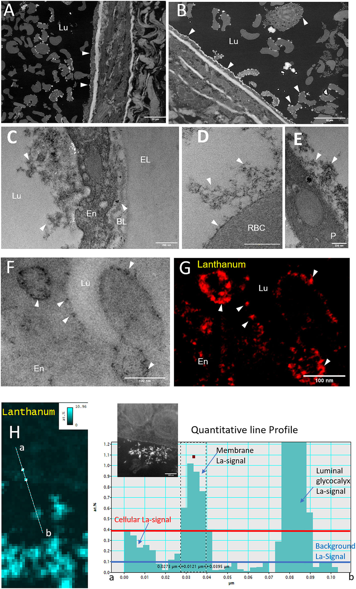 Morphology of the glycocalyx under physiological conditions imaged by EM combined techniques. (A,B) Overview micrographs acquired by SEM observations on resin embedded ultrathin sections. Glycocalyx linked to lanthanum is visualized by high brightness contrast at the surface of the endothelium (arrows) and of circulating blood cells (scale bar = 10 μm). (C–E) Higher Resolution transmission electron microscopy (TEM) images showing a dense glycocalyx developed at the endothelium, red blood, and platelet surface (scale bar = 200 nm). (G,H) Distribution of lanthanum salt by electron energy loss spectroscopy (scale bar = 100 nm); (F) Bright-Field Image; (G) EFTEM image; (H) STEM-electron energy loss spectroscopy (EELS) quantitative La-map (%at.) with line profile. The insert black and white image corresponds to scanning-transmission mode, using a high angle annular darkfield detector (STEM-HAADF) endothelium view (scale bar = 100 nm). BL, Basal Lamina; En, Endothelium; Lu, Lumen; EL, Elastic limiting; P, Platelet; RBC, Red Blood Cell.