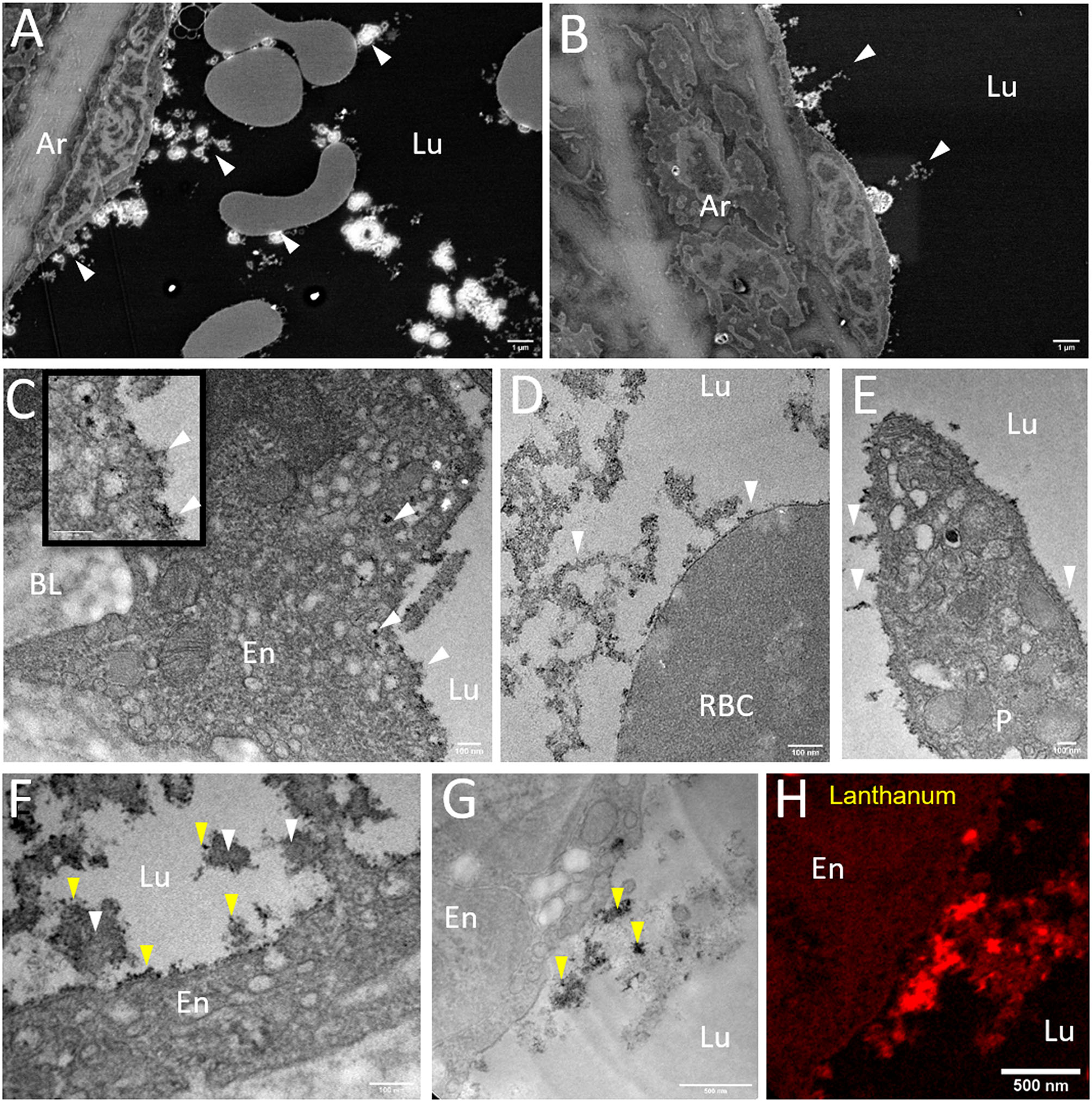 Morphology of the glycocalyx under IR-CPB conditions imaged by EM combined techniques. (A,B) Overview micrographs acquired by SEM observations on resin embedded ultrathin sections (scale bar: 1 μm). (C–F) Higher resolution TEM images showing the glycocalyx weakly developed at the endothelium, red blood and platelet surface (scale bar = 100 nm). (F) Presence of large components (white arrows) in luminal space reacting with lanthanum salt (yellow arrows) as shown by EFTEM imaging (G,H) scale bar = 0.5 μm. Ar, Artery; BL, Basal Lamina; En, Endothelium; Lu, Lumen; P, Platelet; RBC, Red Blood Cell.