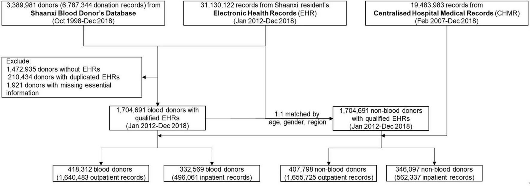 A total of 3.4 million adults, with an equal number and identical demographic characteristics (year of birth, sex and location of residence) of blood donors and non-blood donors, were enrolled on 2012. The one-to-one matching was conducted through a repeated random selection of individuals without any history of blood donation from the Shaanxi Electronic Health Records. The cohort has been so far followed up to the end of 2018, summing to nearly 24 million years of follow-up. The cohort will be followed up prospectively every 3 years until 2030.