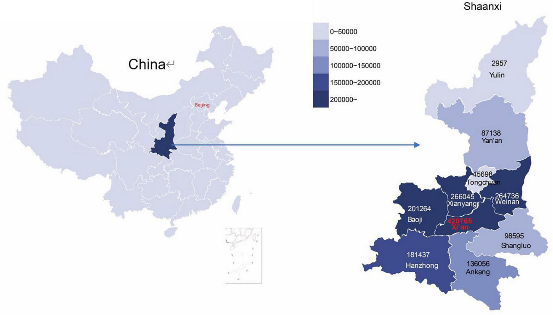 We constructed this cohort through comprehensive data linkages of major population health databases in Shaanxi province. The Shaanxi Blood Donor’s Database was established in 1998 and recorded all voluntary blood donation events in the province. All blood stations on the prefecture-level adopted a standardized blood collection and information management system. During 1998–2018, a total of 67,367,713 donation event records from 3,389,981 blood donors were collected (Figure 1). The database covered all ten prefectures in Shaanxi (Figure 2). The key variables collected at the point of blood donation included information related to demographics, the process of blood donation, anthropometric measures, and medical indicators (Table 1). The Whole Blood and Component Donor Selection requirements by China’s Ministry of Health excluded individuals from blood donation if they have one of the following medical conditions: chronic respiratory diseases, circulatory system diseases, urinary system diseases, autoimmune diseases, blood system diseases, chronic skin disease, allergic diseases, neurological, and mental diseases, infectious diseases, parasite disease, cancers and certain occupational diseases (23). Individuals who previously received a transplant were not eligible for donation. The requirements classified 16 health conditions for temporary deferrals, including dental cleaning, tooth extraction, surgery, abortion, delivery, breastfeeding, upper respiratory infection, acute gastroenteritis, receipt of blood components or products, and recent vaccination (24). Donors are required to have a minimum weight of 50 kg for males and 45 kg for females and a normal systolic (90–140 mm Hg) and diastolic (60–90 mmHg) blood pressure. The donation interval requirement is at least 6 months apart between whole blood donations and 2 weeks apart for apheresis donation, and the legal age for donation was 18–55 years (23). Hemoglobin and blood counts were measured prior to the donation according to the Chinese guidelines for blood donation (25).