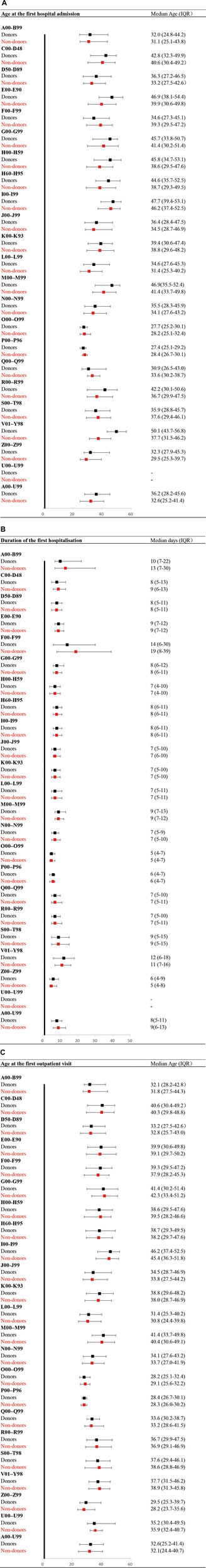 Of the 1.7 million blood donors, 418,312 (24.5%) and 332,569 (19.5%) individuals were outpatients and inpatients, accounting for 1,640,483(96.2%) outpatient and 496,061 (29.1%) inpatient visits. Of the same number of non-blood donors, 407,798 (23.9%) and 346,097 (20.3%) individuals were hospital outpatients and inpatients, accounting for 1,655,725 (97.1%) outpatient and 562,337 (33.0%) inpatient visits. The number of outpatient and inpatient visits by non-blood donors was 0.9 and 3.9% higher than those of the blood donors (p < 0.01). Blood donors demonstrate significantly fewer inpatients visits than non-blood donors for major chronic disease categories (p < 0.01).