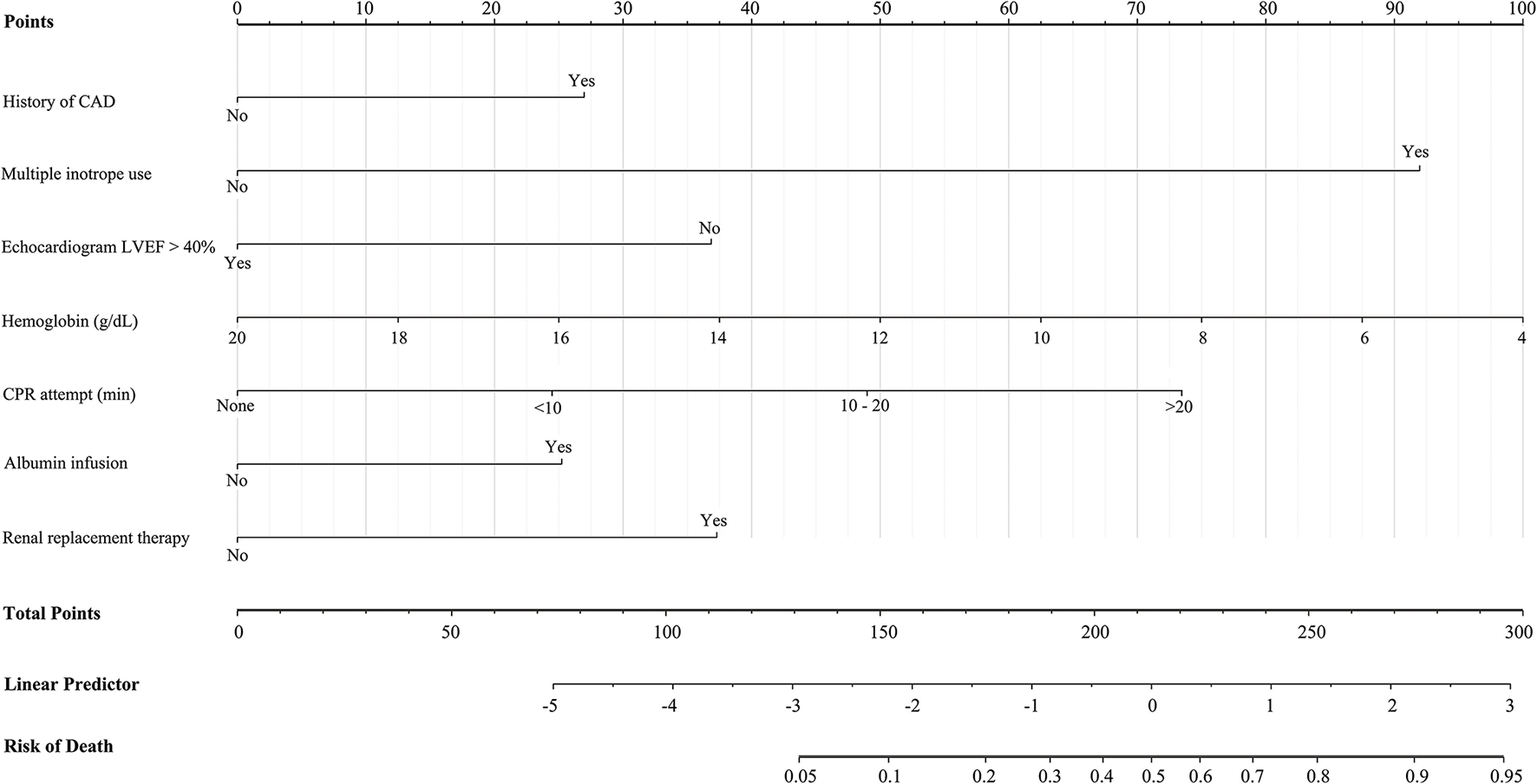 Several mortality predictors have been identified in previous scoring systems. Among them, previous MI or CABG and reduced LVEF were risk factors based on the SHOCK (3) and CardShock risk scores (5), consistent with this study's history of CAD and reduced cardiac function. High creatinine levels or low eGFR were present in all three scores whereas the need for RRT during acute care was determined to be a risk factor in this study. Other predictors identified in this study but not reported in other scores include multiple inotrope use, albumin infusion, lower hemoglobin levels, and longer CPR duration.