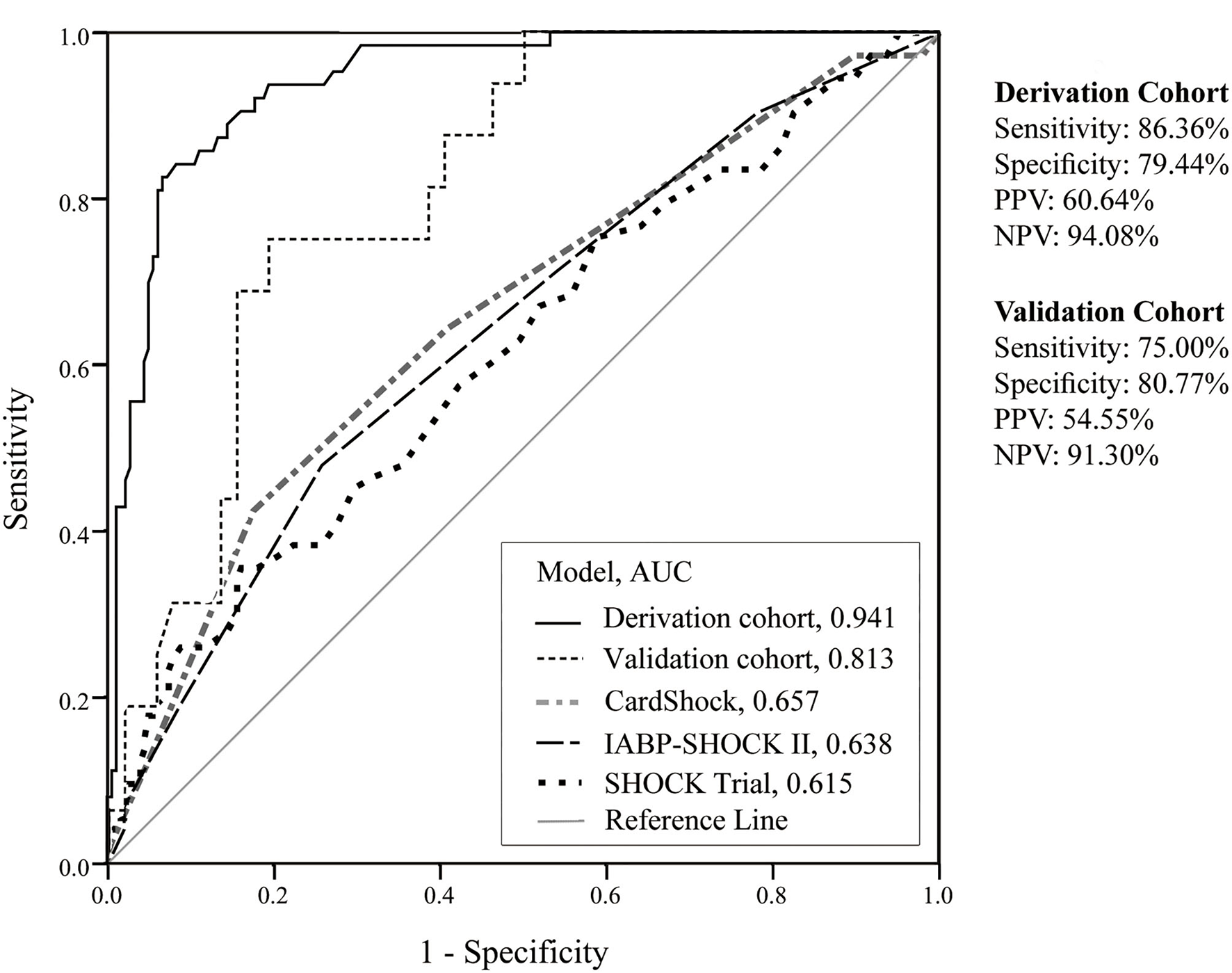 Several risk scores that help predict short-term mortality have been established (3–5). The SHOCK score and Intraaortic Balloon Pump in Cardiogenic Shock II trial (IABP-SHOCK II) trial were developed based on patients with MI and shock (3, 4). The CardShock study enrolled patients with all etiologies of CS, but more than half were acute CS (ACS) cases (5). The epidemiology of shock has evolved in recent years with AMI-related CS (AMICS) accounting for less than one-third of all CS cases, hence the role of hemodynamic stabilization using pharmacologic and nonpharmacologic therapies has been inconsistent (6, 7). All these risk scores revealed modest prognostic accuracy, with an internal validation area under the curve (AUC) of.74, 0.79, and.71, respectively (3–5).