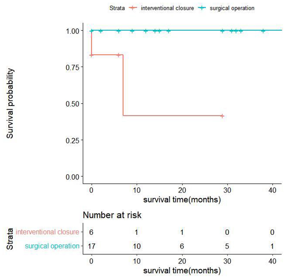 The mean age of the study patients was 64.43 ± 7.54 years, 12(52.2%) were females. There was a significant difference in terms of postoperative residual shunt between the surgical and interventional closure groups (5.9 vs. 100%, respectively; P < 0.001). The overall in-hospital mortality rate was 21.7%; however, even though the surgical group had a lower mortality rate than the interventional closure group (17.6 vs. 33%, respectively), this difference was not statistically significant (P = 0.576). Univariate analysis showed that in-hospital survival group patients were significantly younger than in-hospital death group patients (62.50 ± 6.53 vs. 71.40 ± 7.37 years, respectively; P = 0.016), and that women had a significantly higher in-hospital mortality rate than men (P = 0.037). The average postoperative follow-up time was 18.11 ± 13.92 months; as of the end of the study all 14 patients in the surgical group were alive, Two out of four patients survived and two patients died after interventional closure. Univariate analysis showed that interventional closure was a risk factor for long-term death (P < 0.05).
