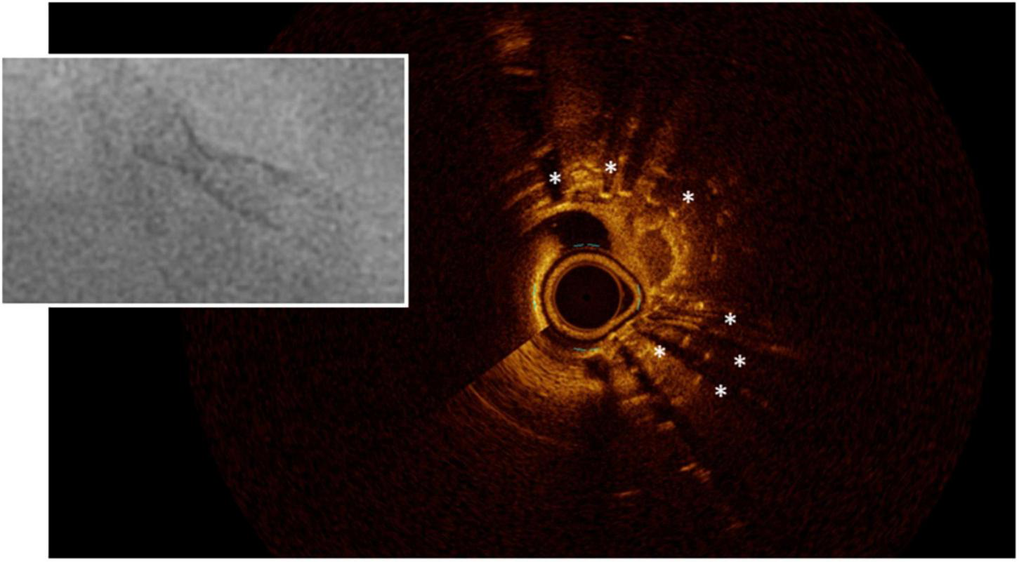 Stent underexpansion. OCT image of an incomplete expansion of a stent resulting in restenosis despite moderate neointima proliferation. The asterisks (*) mark stent struts. The small picture demonstrates the incomplete apposition at angiography.