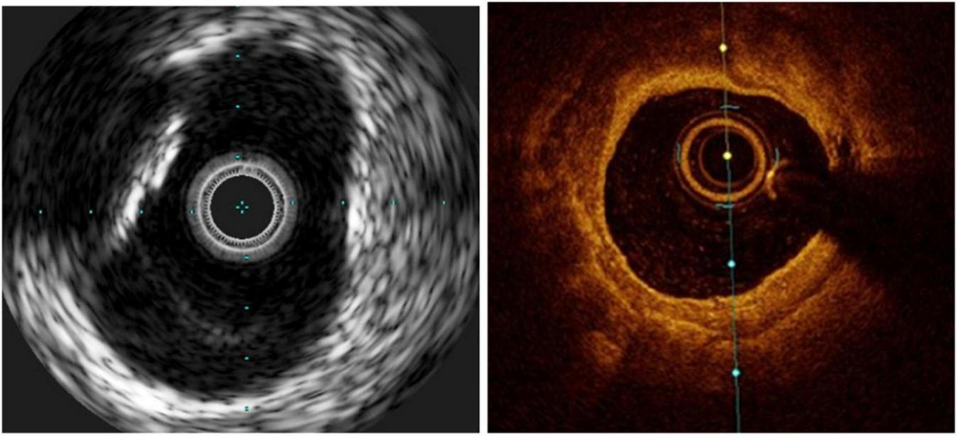 Calcific lesions at intravascular ultrasound (Left) and optical coherence tomography (Right). The limitation of IVUS in this case is that the lesion projects a shadow that does not allow measuring its depth.