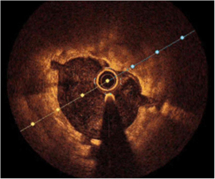 While it is difficult to evaluate calcium thickness or area with IVUS because its surface reflects ultrasound waves almost entirely, OCT can penetrate through calcium, so that its thickness and area can be evaluated (Figure 3). This was shown to be relevant, although to a lesser degree than the arc of calcium, so that it affects the minimal stent diameter achieved (58). In another study, a thinner calcium thickness after rotational atherectomy (optimal threshold was 0.67 mm) predicted the formation of cracks after balloon angioplasty which in turn permitted a larger lumen gain and a greater stent cross-sectional area (59). An OCT-based calcium scoring system has been proposed, whereby a maximum angle of calcium >180°, together with a maximal thickness >0.5 mm, and length >5 mm, predicted stent underexpansion (based on the smallest stent area divided by the average of proximal and distal reference luminal areas) with a slightly better ability than the angiographic detection of severe calcium (60). On the other hand, it has been demonstrated that the detection of calcium fractures by OCT (Figure 4) confirms adequate modification of heavily calcified culprit lesions before stenting and resulted in a greater MSA, and stent expansion immediately post-PCI, as well as smaller percent diameter stenosis, less frequent binary restenosis, and less ischemic-driven TLR, at 10-month follow-up (61).