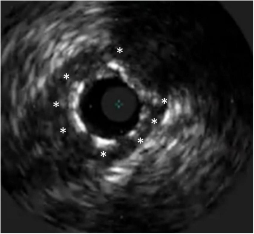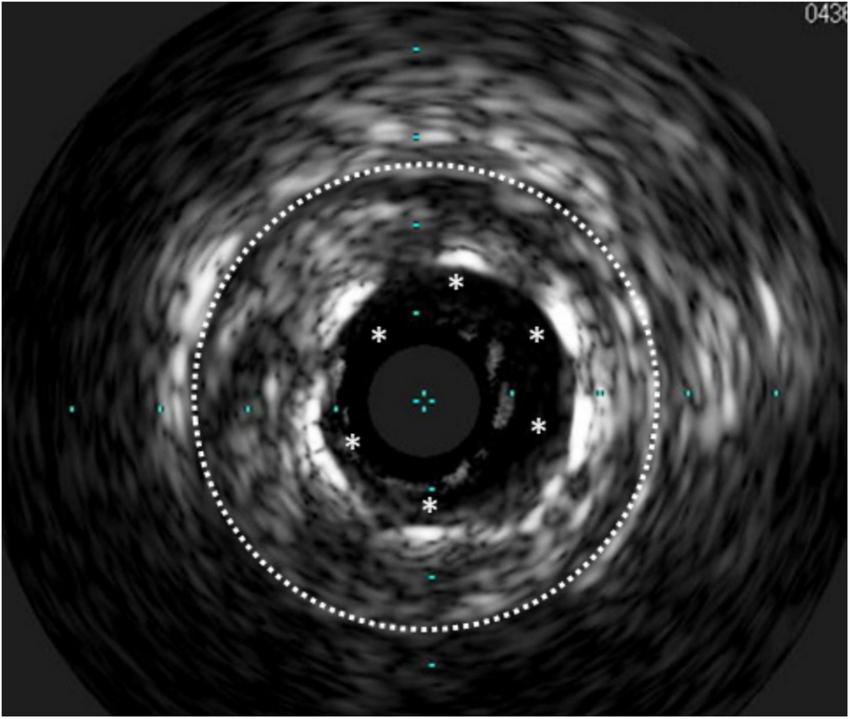 Stent undersizing demonstrated at IVUS. The white dotted line marks the lamina externa, where the stent struts (*) should lie.