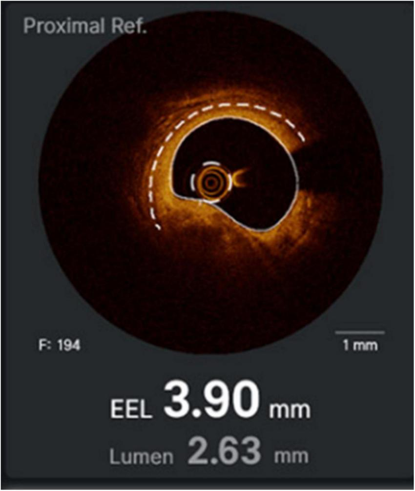 For its superior capacity to distinguish the EEL, IVUS is considered to be the gold standard method for guiding stent sizing (Figure 5). Because of the limited tissue penetration of OCT (1–2 mm) compared to IVUS (5–6 mm), it is often not able to visualize the EEL at the lesion site. The introduction of artificial intelligence-based methods in the latest iteration of the OCT software by the company Abbott vascular, however, significantly streamlines these processes (Figure 6). Therefore, an algorithm was proposed by the ILUMIEN III and IV studies (54, 69), where the EEL diameter was used if the EEL circumference was visible for ≥180°. In such case, the proximal and distal reference mean EEL diameters were measured, and the smaller of these diameters rounded down to the nearest 0.25 mm was used. In case the EEL cannot be seen ≥180°, the stent diameter was determined as 100% of the lumen diameter. Compared to the respective reference, a final lumen area ≥90% was considered acceptable. Using this algorithm, OCT-guided PCI was non-inferior to operator-directed IVUS guidance in terms of the post-PCI MSA, with no difference in procedural MACE up to 1 year (54, 68). Because ILUMIEN III was underpowered to detect differences in clinical outcomes, another adequately powered ongoing trial, ILUMIEN IV trial (NCT03507777), is geared to rigorously test this aspect (69).