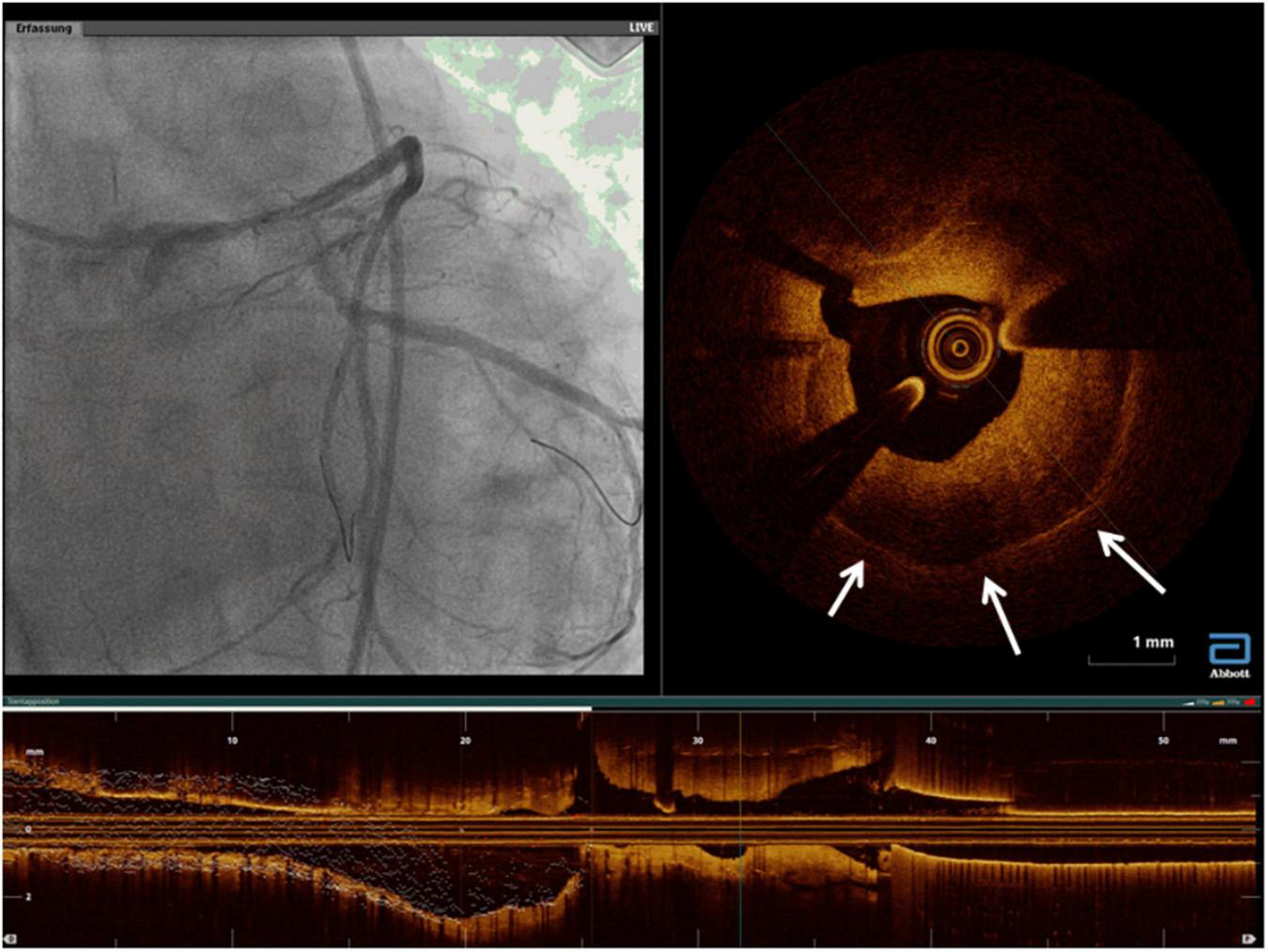 Calcific neointima. The white arrows mark the stent struts, the left quadrant arc occupied by neointima presenting calcific neoatherosclerosis. The remaining homogeneous neointima is compatible with fibrous tissue.