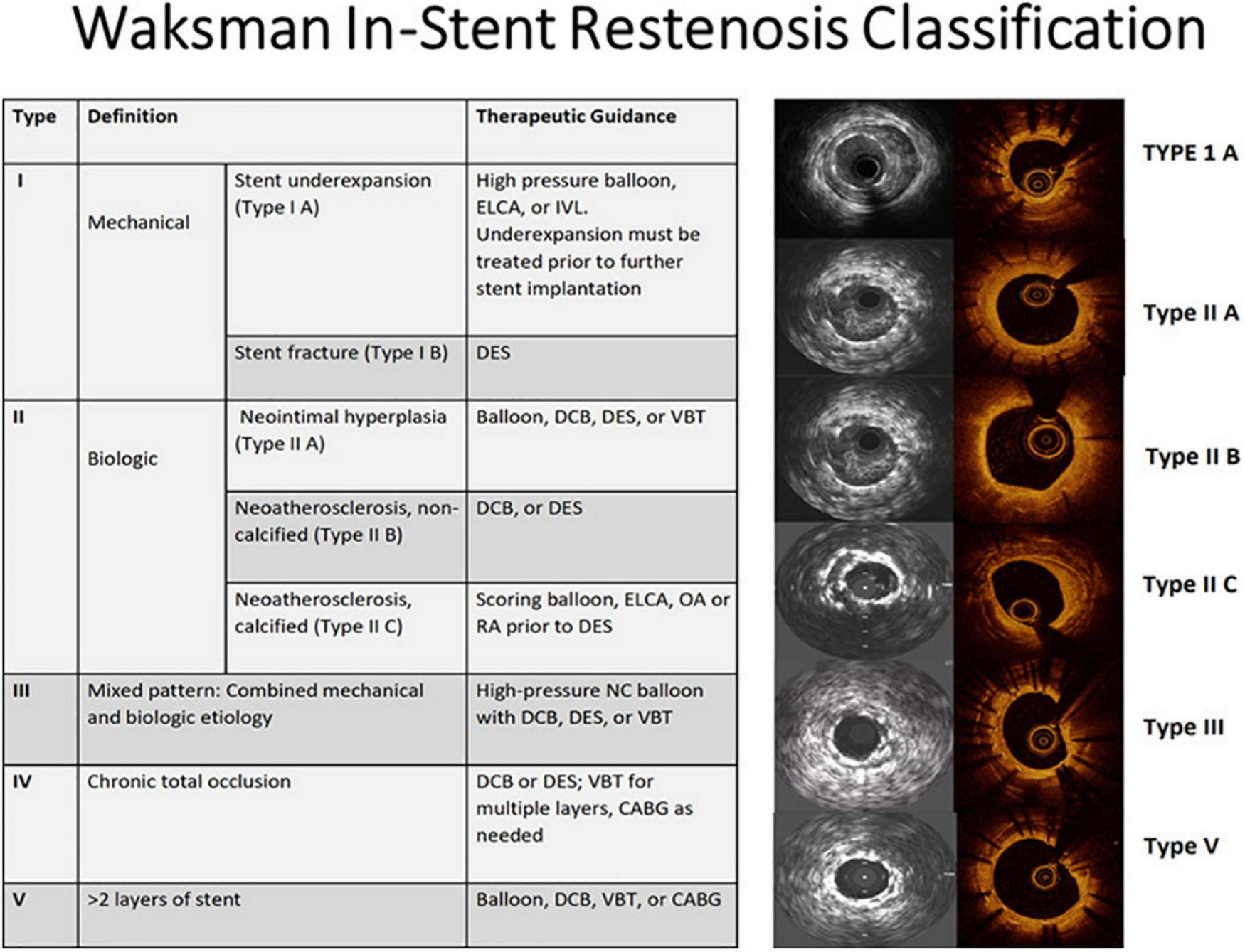 Mehran et al. originally proposed an angiographic classification for ISR (classes I to IV) that predicted more TLR with increasing ISR class (112). Although the classification was based on the geographic position of ISR on angiography in relation to the previously implanted stent, its accuracy was verified in the same study by IVUS. Despite that, the classification has several limitations; for instance, it was developed in the BMS era just as DES was dawning. Consequently, in RIBS-II trial, for example, which compared SES with balloon angioplasty as a treatment for ISR, the Mehran classification was unable to predict late loss in the SES group (113). On the other hand, such classification does not really address the possible underlying causes for ISR, nor does it describe the nature of the restenotic tissue itself. As a result, it would not be able to prescribe management pathways given the plethora of newly developed interventional tools available to tackle ISR.