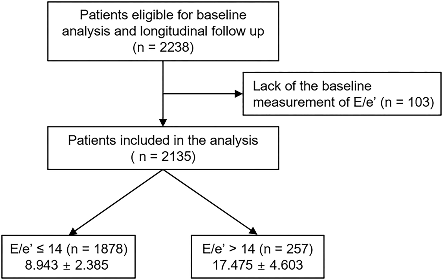 Flow diagram of the study participants. E/e′, ratio of the early transmitral blood flow velocity to early diastolic velocity of the mitral annulus.