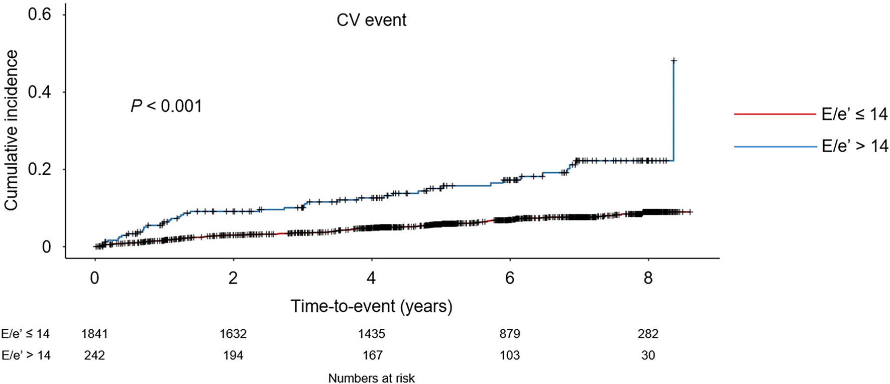 Kaplan-Meier analyses of cardiovascular (CV) event-free survival by E/e′. CV event-free survival curve is depicted. P-value determined using log-rank test. E/e′, ratio of the early transmitral blood flow velocity to early diastolic velocity of the mitral annulus.