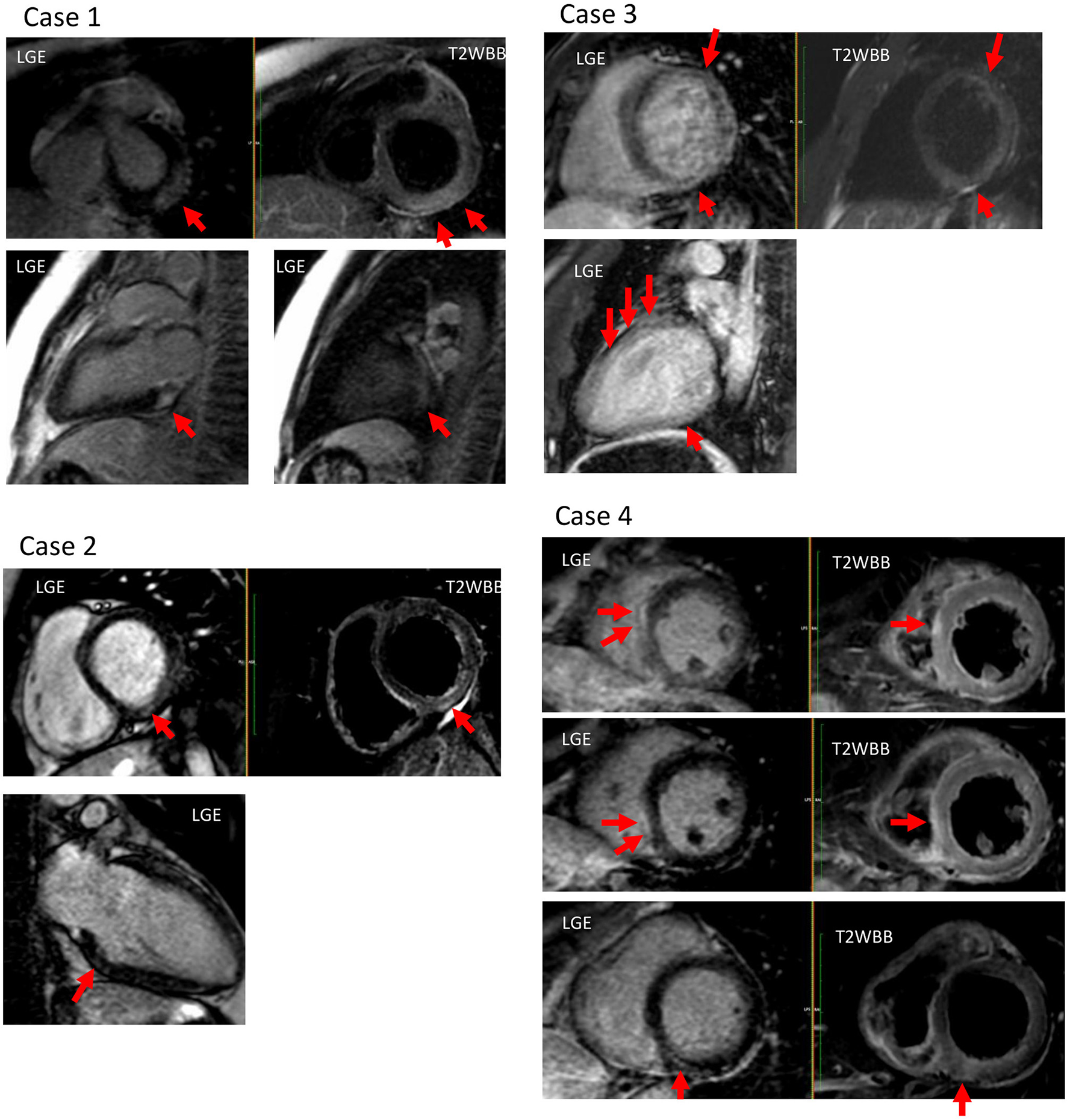 Cardiac magnetic resonance imaging (MRI) of all profiled cases. Case 1: T2 high signal intensity and late-gadolinium enhancement (LGE) were observed at the sub-epicardial wall of the basal-mid inferolateral left ventricular (LV). Case 2: T2 high signal intensity and LGE were observed at the mid wall of the basal inferior LV. Case 3: T2 high signal intensity and LGE were observed at the mid wall of the anterior, and at the inferior LV. Case 4: T2 high signal intensity and LGE were observed at the mid-wall of basal inferior, and at the sub-epicardial wall of the mid- and inferoseptum LV.
