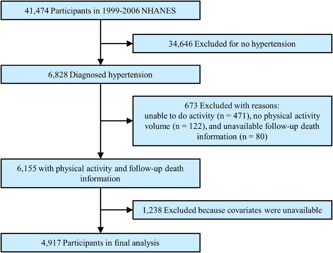 The study population was adult patients with hypertension with complete data on leisure-time PA (i.e., moderate and/or vigorous PA), follow-up death index, and covariates. Hypertension was determined by specialist doctors when a subject had a diagnosed hypertension history, or non-same-day randomised records of 3 times systolic blood pressure ≥ 140 mmHg or diastolic blood pressure ≥ 90 mmHg, or was taking antihypertensive drugs. Each blood pressure was calculated as a mean value from three consecutive right-hand readings of a mercury sphygmomanometer after resting quietly in a sitting position for 5 min. The total number of participants in the primary survey was 41,474. After excluding participants without hypertension (n = 34,646), who were unable to perform any PA (n = 471), who had unavailable MV-PA data (n = 122), without follow-up death information (n = 80), or without covariate data (n = 1,238), a total of 4,917 patients were enrolled in the final analysis (Figure 1).