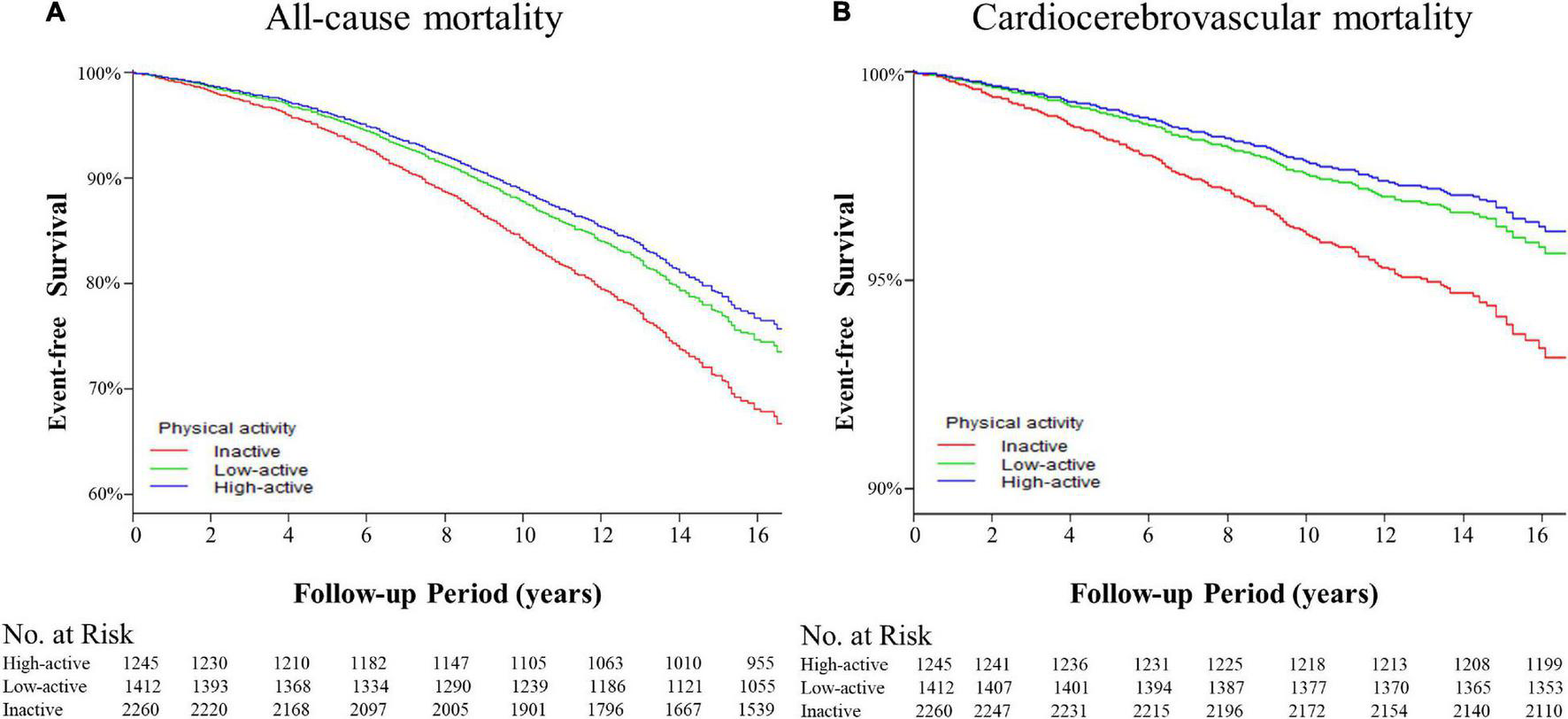 The Kaplan-Meier curves for event-free survival of the adverse outcomes among patients with hypertension. (A) The event-free survival rate for the all-cause mortality. High-active group vs. low-active group, p = 0.611; high-active group vs. inactive group, p < 0.001; low-active group vs. inactive group, p < 0.001 by log-rank tests. (B) Event-free survival rate for cardiocerebrovascular mortality. High-active group vs. low-active group, p = 0.975; high-active group vs. inactive group, p < 0.001; low-active group vs. inactive group, p < 0.001 by log-rank tests.
