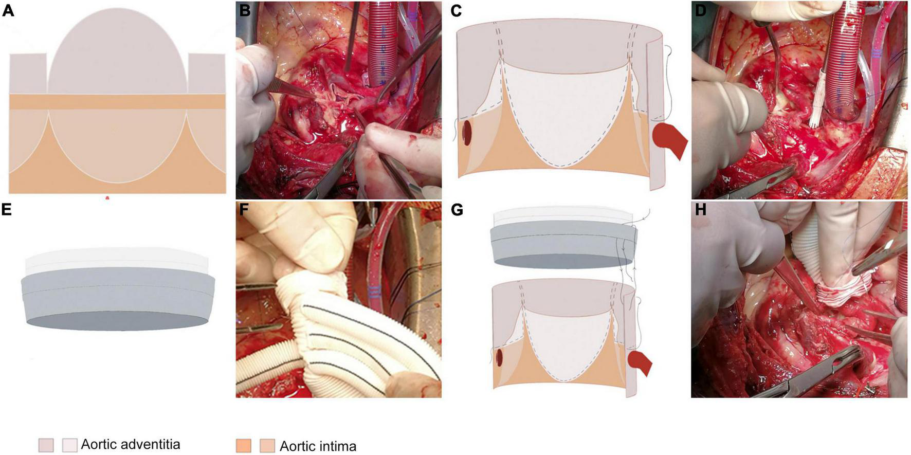 The extended adventitial inversion suture and graft eversion anastomosis technique. (A,B) Only the aortic intima is transected 0.5 cm above the STJ while leaving the aortic adventitia intact. The reserved aortic adventitia is cut along the three valve junctions longitudinally along the aortic axis to the edge of the transected aortic intima. The shape of the aortic adventitia is trimmed according to the shape of the three aortic sinuses such that it inverses toward the base of the sinus with the non-coronary sinus reaching the base of the sinus and the left/right coronary sinuses reaching the upper edge of the coronary ostia. (C,D) The trimmed aortic adventitia is inversed toward the three coronary sinuses and secured with 1–2 continuous sutures for fixation. (E,F) Eversion of the proximal end of the graft outwards by 1 cm. (G,H) Performing the vascular grafts eversion, insertion into the aortic lumen to align the edges of the two tubes, and suturing the vascular grafts to the aortic wall 1–2 times with an edge distance of 0.5 cm.