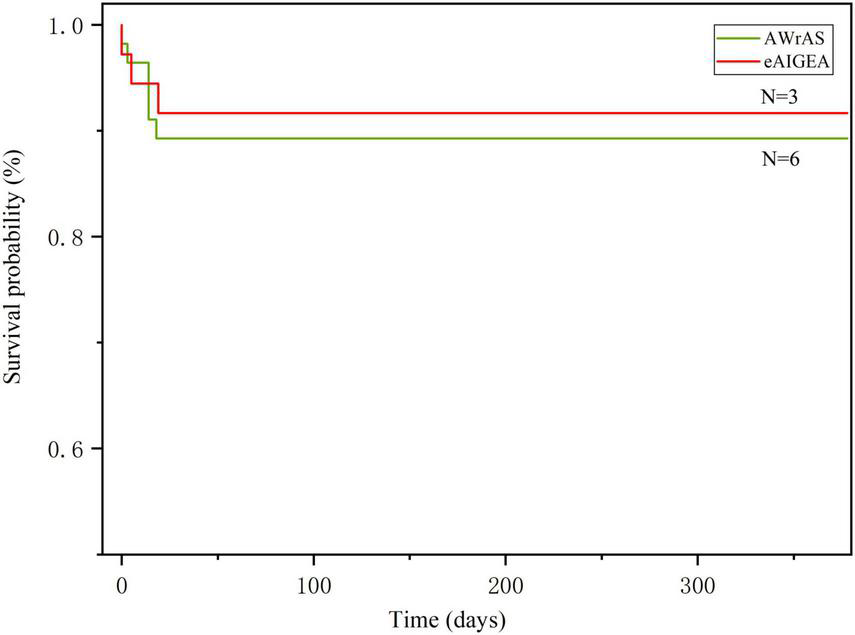 The general follow-up time was 303–378 days, with an average of 339.9 ± 18.62 days. During the follow-up period, nine patients died from circulatory failure, all during postoperative hospitalization, which included three patients in group A and six in group B (two patients underwent secondary thoracotomy for hemostasis), with aortic-related mortality rate within 30 days after surgery 9.78%. One patient in group B died in a traffic accident during the follow-up period and, as such, the results of their last follow-up visit were included in the study. The results of the logarithmic rank survival curve log-rank test results (χ2 = 0.16, P = 0.69) and the Breslow test results (χ2 = 0.18, P = 0.66) indicated that there were no significant statistical differences between the two surgical methods in terms of the short-term postoperative mortality rate (Figure 3).