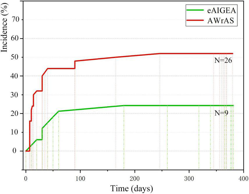 The first occurrence time of reoperation-related events between the two groups was recorded (primarily the time of the first occurrence for patients with multiple reoperation-related events), with the incident time curve of the first reoperation-related event plotted accordingly (Figure 5). The log-rank test (χ2 = 7.08, P < 0.01) and Breslow test (χ2 = 8.12, P < 0.01) results indicated that there were significant differences in the incidence of events related to early postoperative reoperation between the two groups.