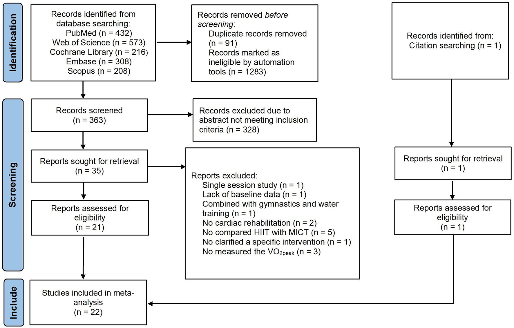 A PRISMA diagram of literature search and selection was presented in Figure 1. The initial search resulted in 1,738 articles from journals indexed in the PubMed, Web of Science, Cochrane Library, Embase, Scopus and other ways. The duplicated (n = 91) and ineligible documents (n = 1283) were excluded by automation tools. The remaining articles (n = 364) were screened. Three hundred and twenty-eight articles did not meet the inclusion criteria and thus were excluded. The remaining articles (n = 36) were read in full text and 22 articles were finally included in this study. Fourteen articles were excluded because of single-session intervention (n = 1), the lack of baseline data (n = 1), the study combined with gymnastics and underwater sports (n = 1), no cardiac rehabilitation (n = 2), without compared HIIT with MICT (n = 5), no clarified a specific intervention (n = 1) and no measured the VO2peak (n = 3).