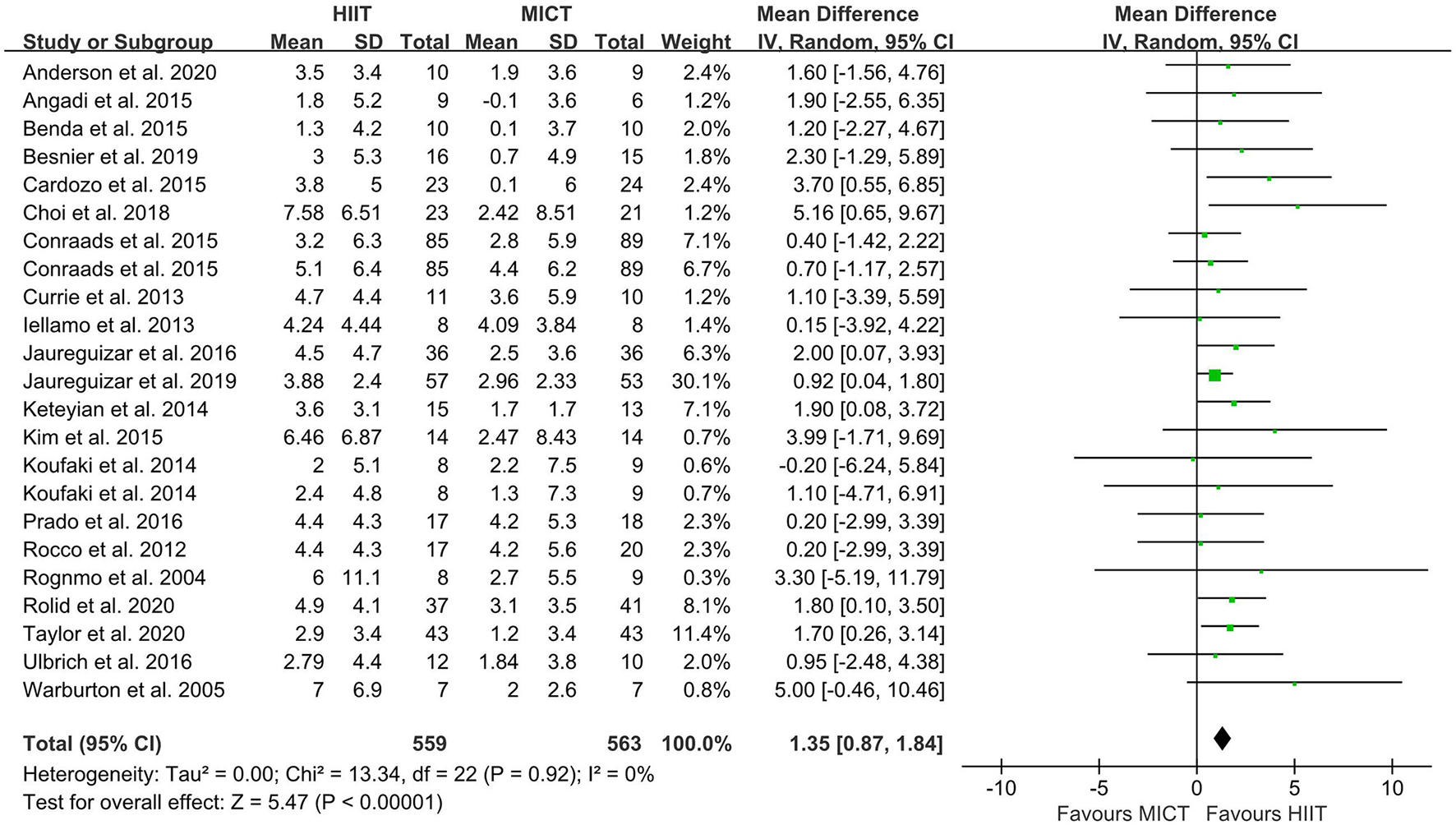 Forest plot depicting cardiorespiratory fitness changes as a HIIT vs. MICT. HIIT, high-intensity interval training; MICT, moderate-intensity continuous training.