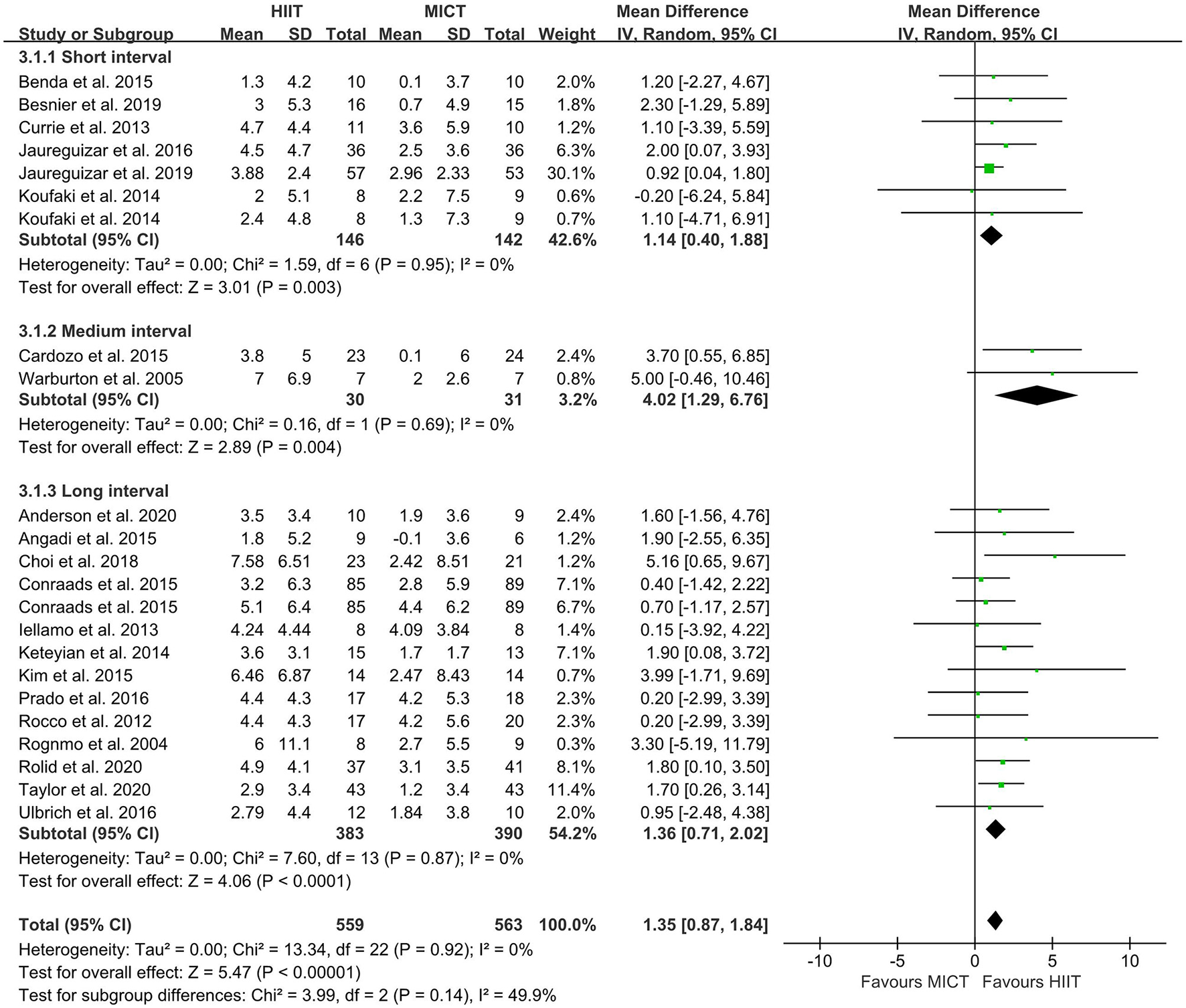 Forest plot of subgroup analysis by a different model of HIIT (short-interval, medium-interval and long-interval HIIT). HIIT, high-intensity interval training; MICT, moderate-intensity continuous training.