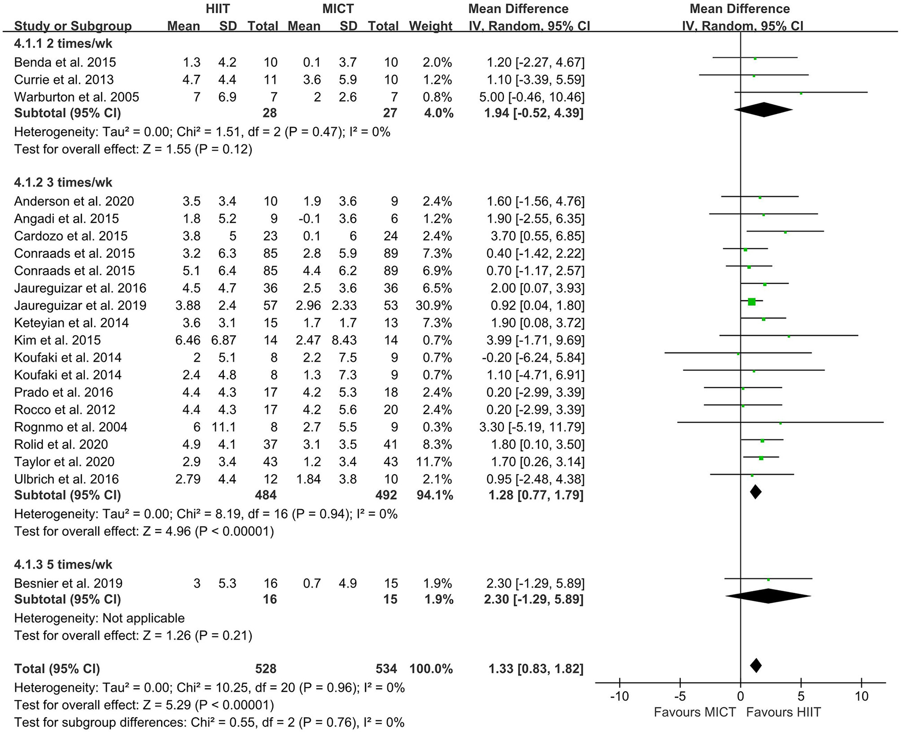 Forest plot of subgroup analysis by different frequencies of HIIT (2 times a week, 3 times a week, and 5 times a week). HIIT, high-intensity interval training; MICT, moderate-intensity training.