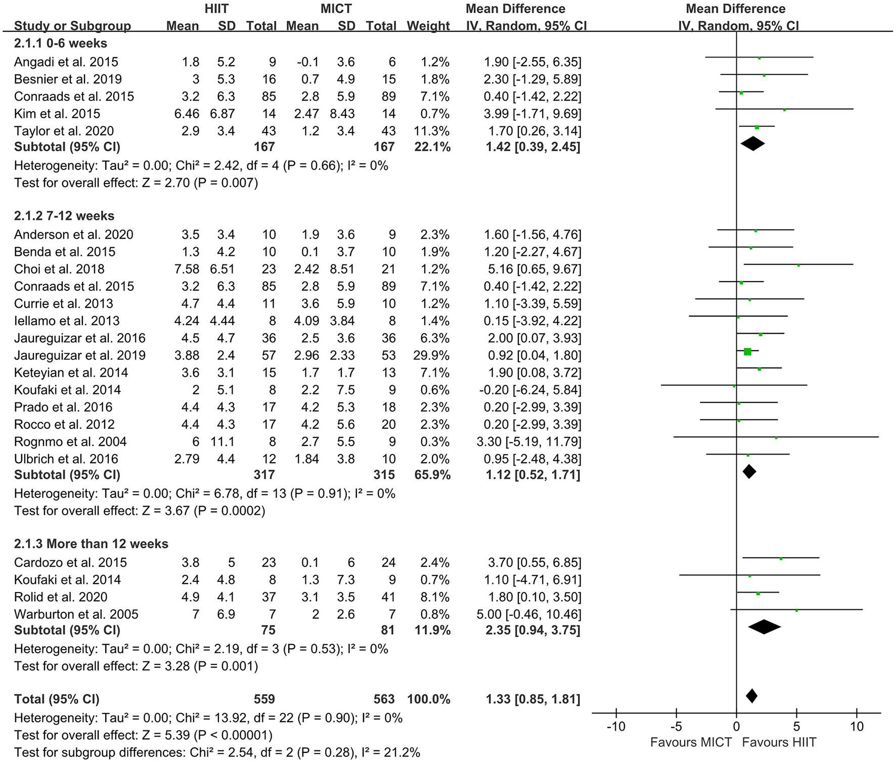 Forest plot of subgroup analysis by different intervention duration (0–6 weeks, 7–12 weeks, more than 12 weeks). HIIT, high-intensity interval training; MICT, moderate-intensity training.