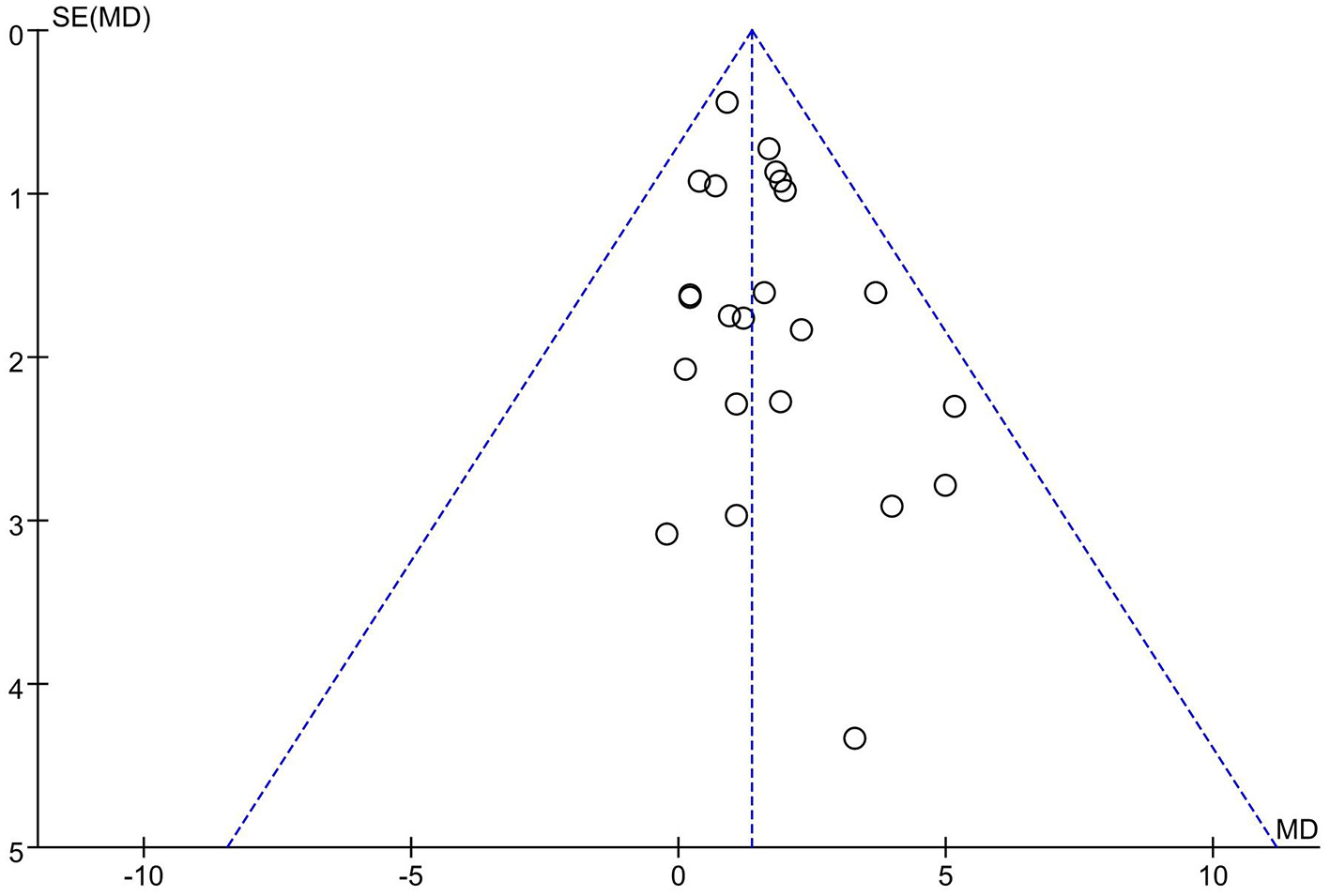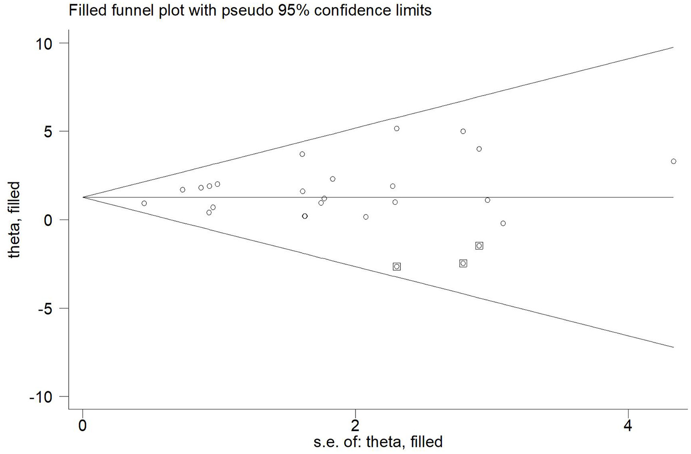 Twenty-one articles (23 studies) were examined for publication bias. Visual inspection of the funnel plot (Figure 7) was asymmetry, but Egger's test (p = 0.101) revealed there was no significant publication bias. The trim and fill adjusted 26 studies, and the mean difference was 1.26 (95% CI = 0.78–1.74). The three imputed hypothetical studies produced a symmetrical funnel plot (Figure 8). Further research would include the three studies to guarantee the symmetry of the funnel chart and eliminate potential publication bias.