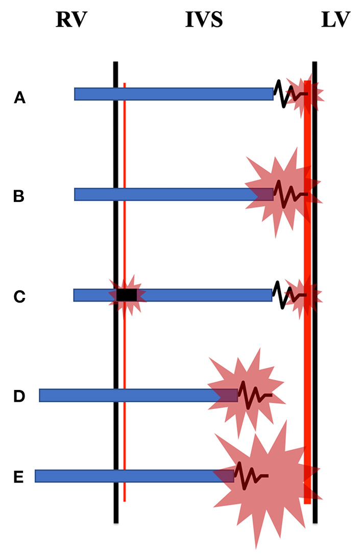 Figure 1. Diagrammatic sketch of left bundle branch pacing (LBBP) and left ventricular septal pacing (LVSP) with different pacing modes. (A) Selective LBBP (SLBBP) captures only the left bundle branch (LBB) trunk or its proximal bundle, resulting in physiologically left ventricle (LV) excitation but delayed right ventricle (RV) excitation. Non-selective LBBP (NSLBBP) is divided into two types: (B), which excites the LBB and surrounding myocardium, and (E), which excites the LBB and the left ventricular septal myocardium. (C) In bipolar pacing configuration, the cathode tip of LBBP captures the LBB and the anode ring captures the right bundle branch at the same time, probably due to the anodal capture. (D) LVSP captures only the left ventricular septal myocardium. RV, right ventricle; IVS, interventricular septum; LV, left ventricle.