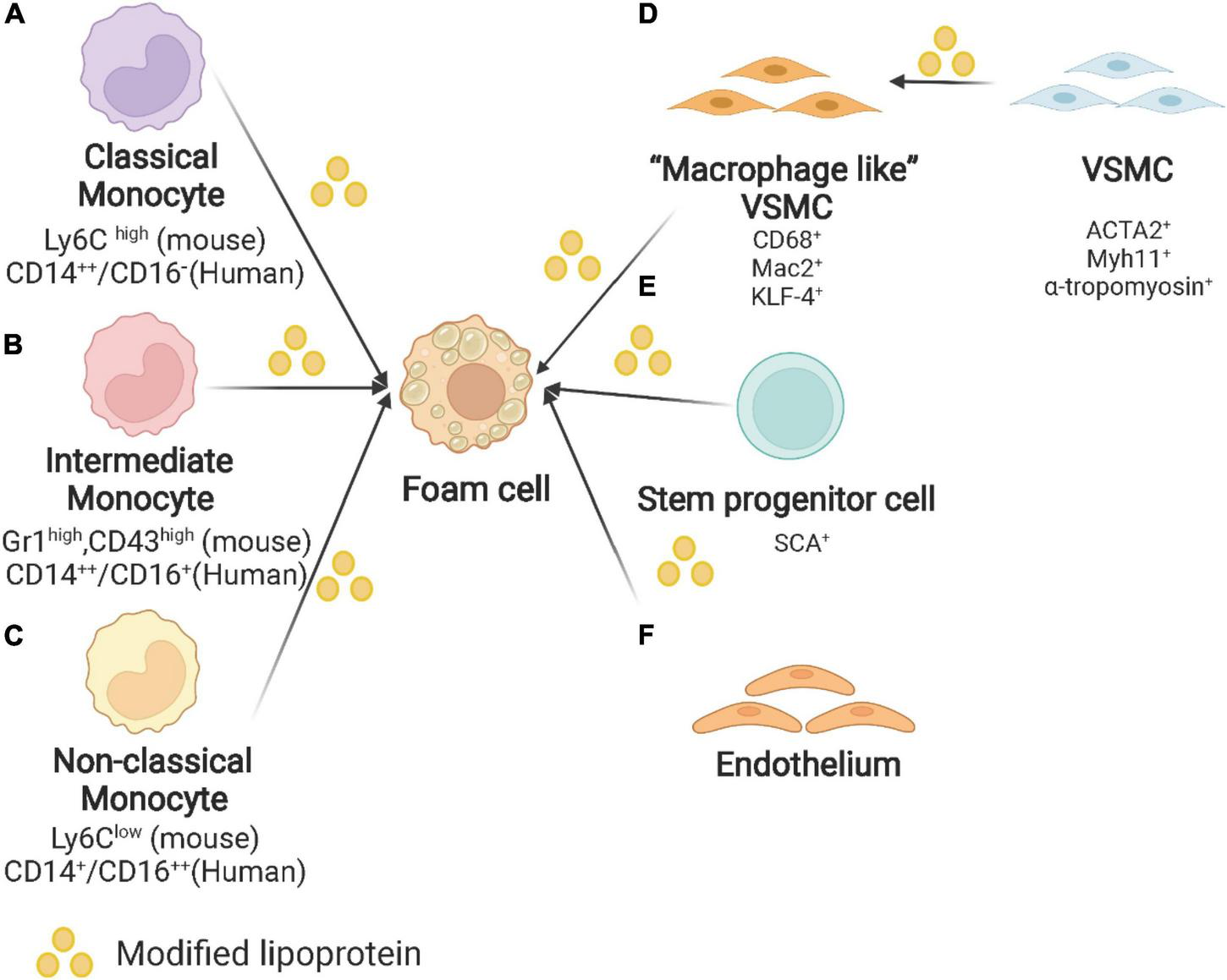 Origin of foam cells in atherosclerotic plaques. (A) Classical monocyte: Ly6Chigh monocytes in mice and CD14++/CD16– in humans. (B) Intermediate monocyte: Gr1high, CD43high in mouse and CD14++/CD16+ in human. (C) Non-classical monocyte: Ly6Clow monocytes in mice and CD14+/CD16++ in humans. (D) VSMC: VSMC undergoes phenotypic switching to macrophage-like VSMC and finally converts into foam cells. (E) Other origins of foam cells: stem/progenitor cells (SPCs) and endothelium. Created with BioRender.com.