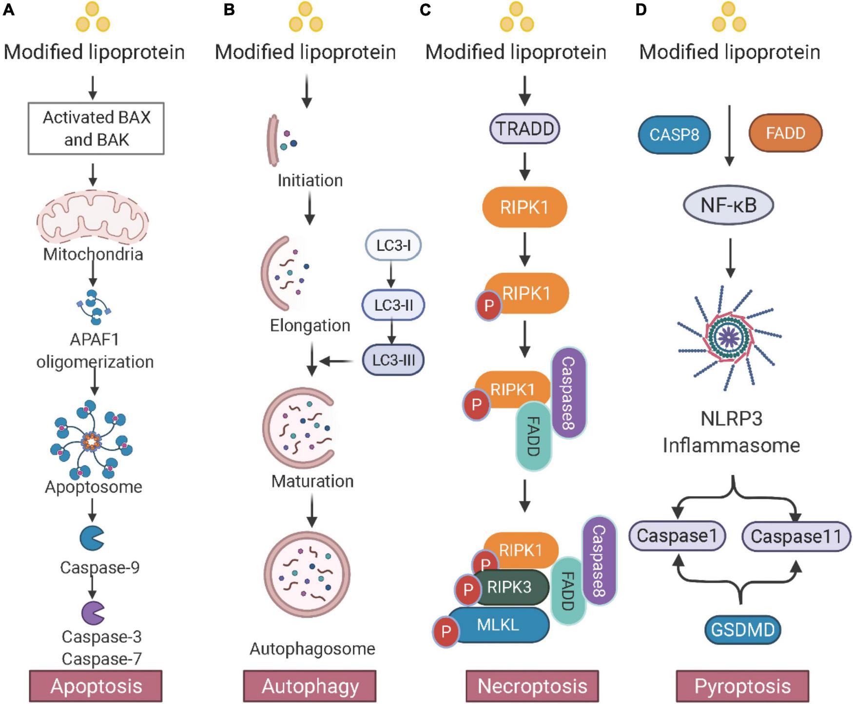 Consequences of foam cells in atherosclerosis. (A) Apoptosis: The mitochondrial intermembrane protein is released and triggers apoptotic protease activating factor 1 (APAF1) and apoptosome, leading to DNA fragmentation. (B) Autophagy: Double membrane autophagosomes are fused with lysosomes for degradation. The microtubule-associated protein 1A/1B light chain 3 (LC3) conjugation system participates in the membrane elongation and formation of the autophagosome. (C) Necroptosis: Activated TRADD (TNFRSF1A associated via death domain) triggers the phosphorylation of RIPK1 and RIPK3 and induces the downstream MLKL. (D) Pyroptosis: Inflammatory stimuli activate the NF-κB pathway and the NOD-like receptor 3 (NLRP3) inflammasome. NLRP3 then causes pyroptosis through caspase-1- and caspase-11-mediated cytoplasmic protein gasdermin D (GSDMD). Created with BioRender.com.